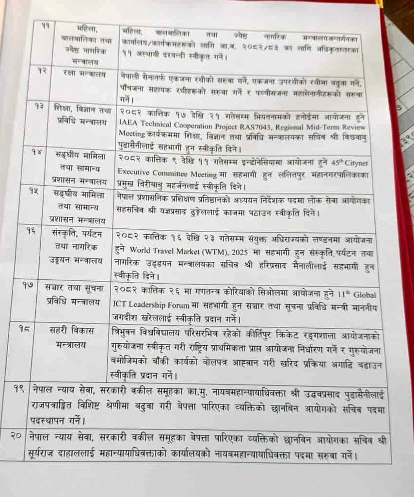 मन्त्रिपरिषद् बैठकका २० निर्णय सार्वजनिक, ११ देशका लागि रहेका राजदूत फिर्ता