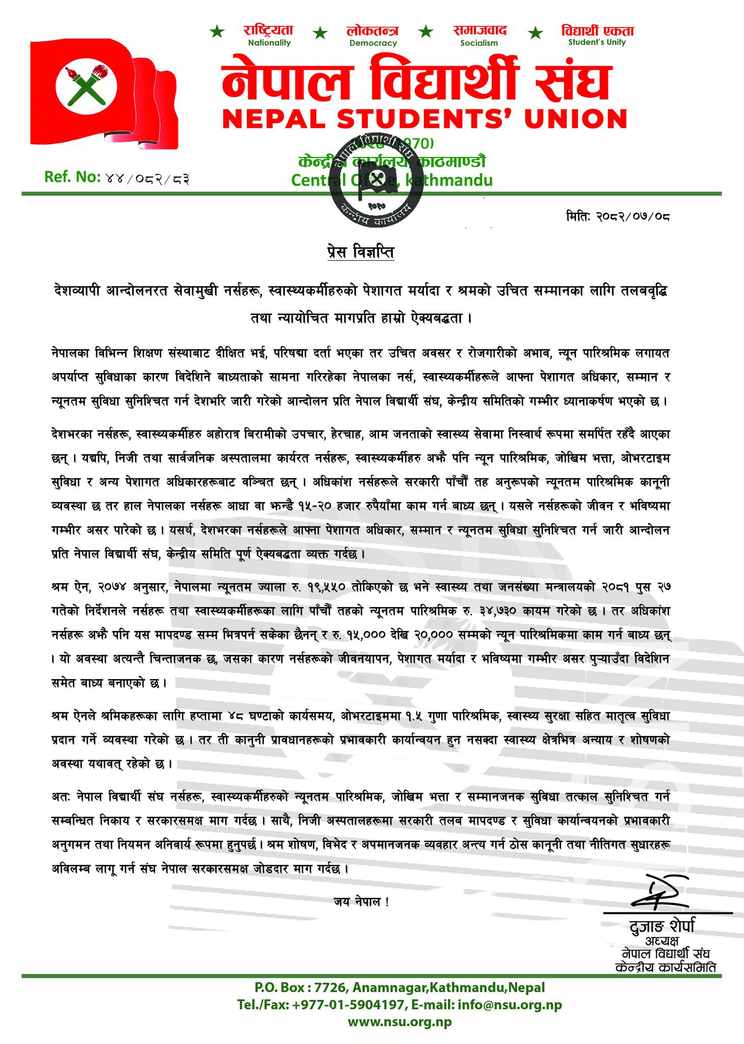 विज्ञप्तिमा भनिएको छ, “देशभरका नर्सहरूले आफ्ना पेशागत अधिकार, सम्मान र न्यूनतम सुविधा सुनिश्चित गर्न जारी आन्दोलनप्रति नेपाल विद्यार्थी संघ पूर्ण ऐक्यबद्धता व्यक्त गर्दछ।”