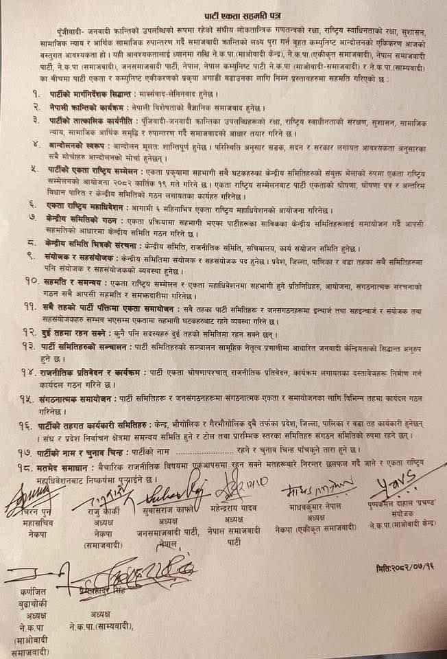 आठ वाम दलबीच एकता गर्न लिखित सहमति, १९ गते औपचारिक रूपमा एकता घोषणा