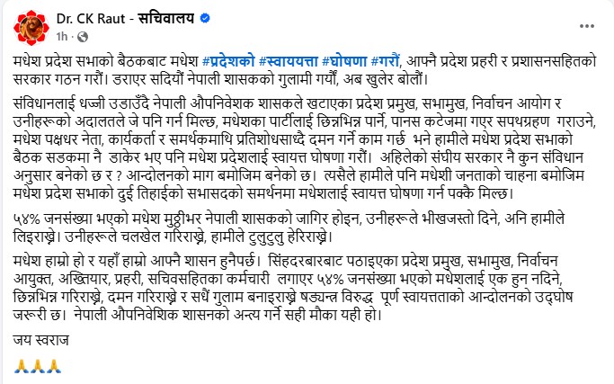 उनले मधेशी जनताको आफ्नै शासन र स्वायत्तता सुनिश्चित गर्न ‘‘स्वायत्तता आन्दोलन’’को आह्वान गरेका छन्। फेसबुकमार्फत आफूले व्यक्त गरेको विचारमा, डा. राउतले भने, ‘‘मधेश हाम्रो हो र यहाँ हाम्रो आफ्नै शासन हुनैपर्छ। अब मधेश प्रदेशको स्वायत्तताको घोषणा गर्नु अत्यन्त जरूरी छ।’’