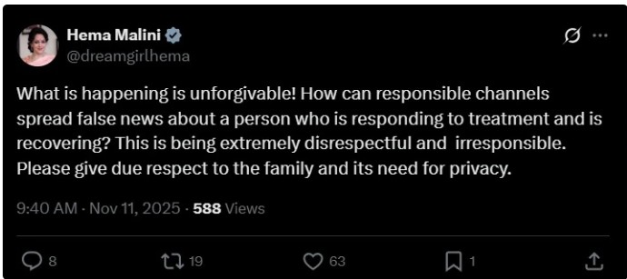 धर्मेन्द्रकी छोरी एषा देओलले पनि इन्ष्टामा लेखेकी छन्,“मिडियाले अत्यधिक हल्ला फैलाइरहेको छ। मेरा बुबा स्थिर छन् र निको हुँदैछन्। हामी सबैसँग परिवारको गोपनीयताको सम्मान गर्न अनुरोध गर्छौं। छिटो निको होउनुका लागि धन्यवाद।”