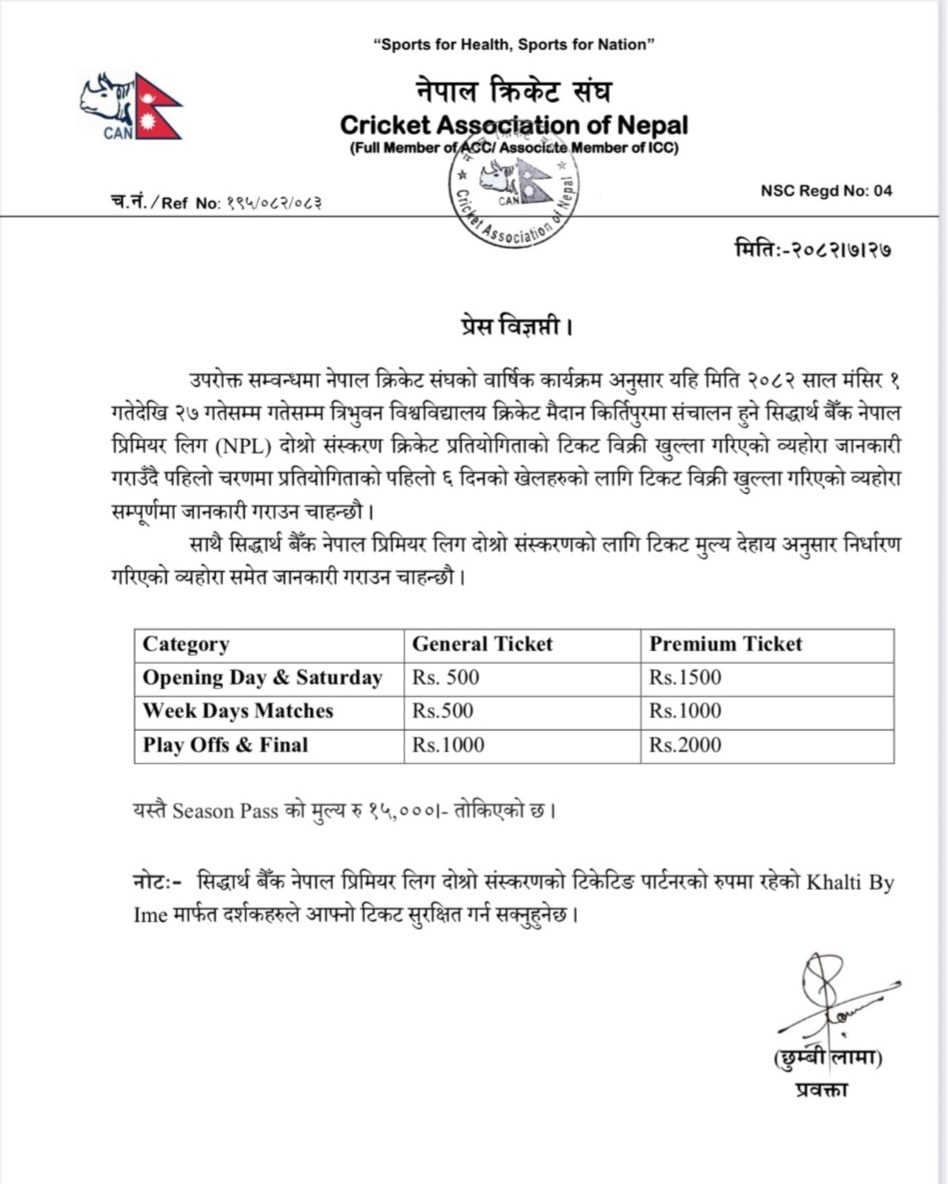 एनपीएल–२ का लागि टिकट बिक्री सुरु, मूल्यदर सार्वजनिक