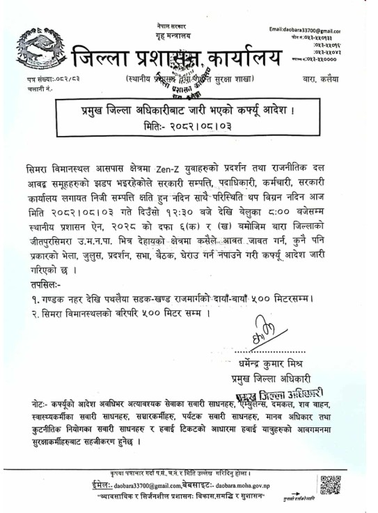 बारा। बाराको सिमरामामा कर्फ्यू लगाइएको छ । एमाले नेता महेश बस्नेत बारा आउने भएपछि जेनजी युवाहरुले विमानस्थल घेराउ गरेका थिए । घेराउका क्रममा प्रहरी र जेनजीहरु विच झडप भएको थियो । झडप नियन्त्रण गर्न स्थानीय प्रशासनले कर्फ्यू लगाएको हो ।