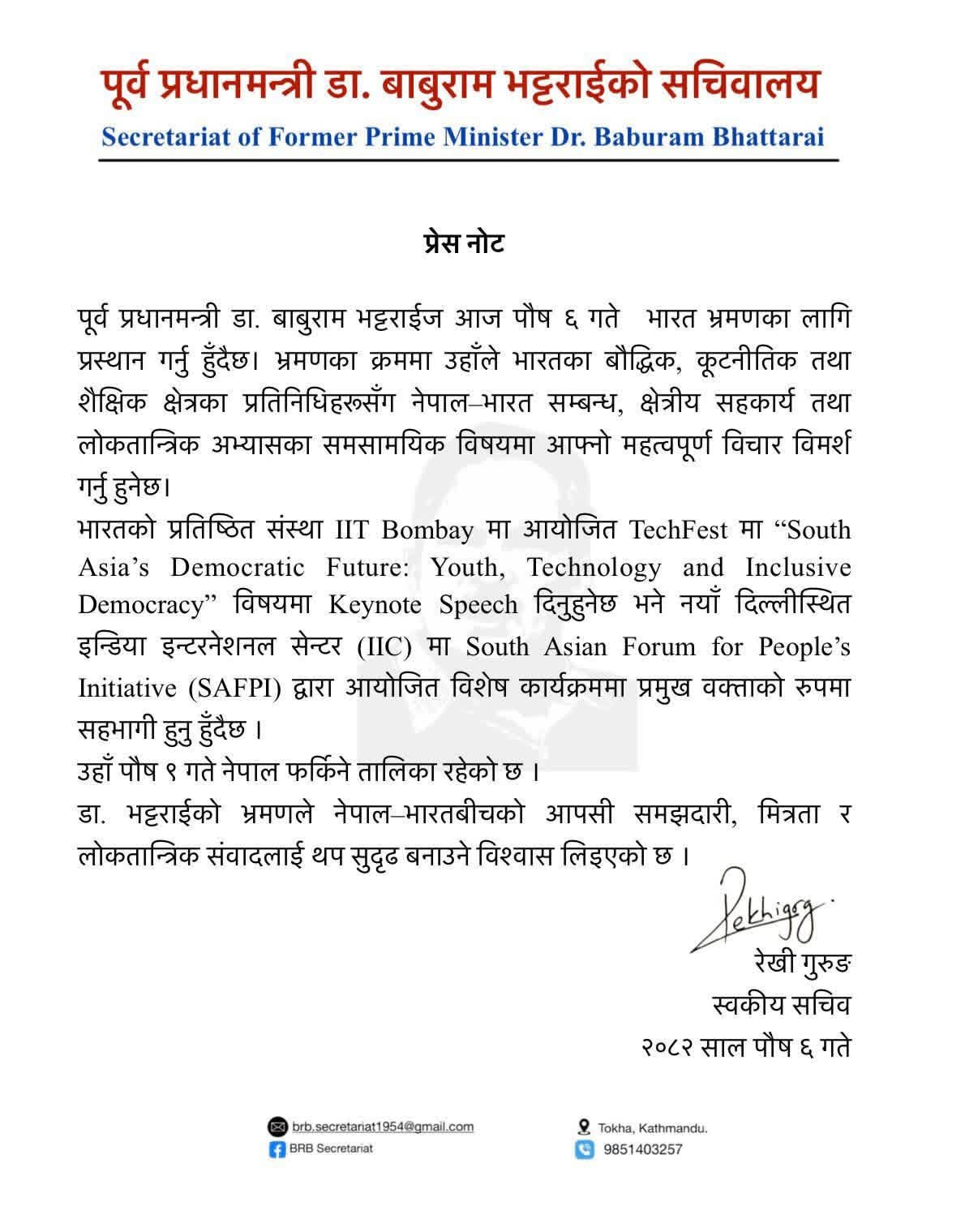 भ्रमणको क्रममा डा भट्टराई भारतको प्रतिष्ठित शैक्षिक संस्था आईआईटी बम्बईमा आयोजना हुने टेकफेस्टमा सहभागी हुँदै ‘दक्षिण एसियाको लोकतान्त्रिक भविष्य: युवा, प्रविधि र समावेशी लोकतन्त्र’ विषयमा विशेष सम्बोधन गर्ने कार्यक्रम रहेको छ।