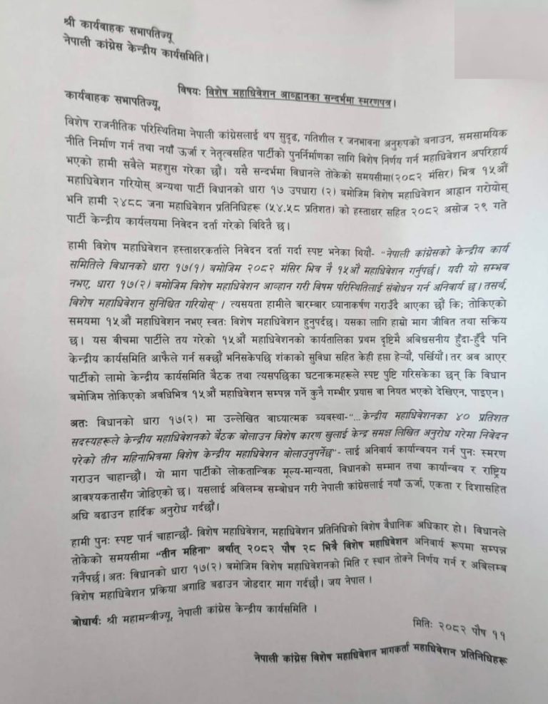 काठमाडौ । नेपाली कांग्रेसभित्र नियमित महाधिवेशनको समय र प्रक्रिया स्पष्ट नदेखिएपछि विशेष महाधिवेशनको माग पुनः सशक्त रूपमा उठेको छ। विशेष महाधिवेशन पक्षधर समूहले पार्टी नेतृत्वलाई ध्यानाकर्षण गराउँदै शुक्रबार स्मरण पत्र बुझाएको हो।