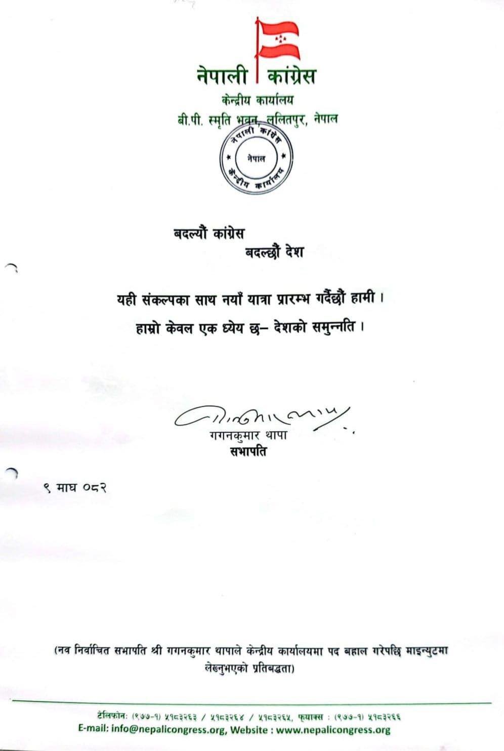 काठमाडौ । नेपाली कांग्रेसले नयाँ नेतृत्वसहित औपचारिक रूपमा काम सुरु गरेको छ। विशेष महाधिवेशनबाट सभापतिमा निर्वाचित गगन थापाले पदबहालीसँगै पार्टी सुधार र देश निर्माणलाई केन्द्रमा राख्दै आफ्नो पहिलो निर्णय सार्वजनिक गरेका छन्।