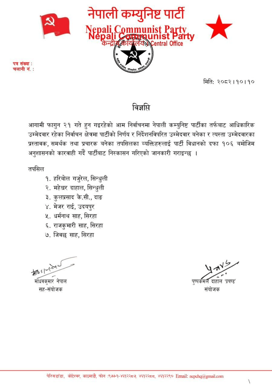 पार्टीले सार्वजनिक गरेको विज्ञप्तिमा आधिकारिक उम्मेदवार तोकिएका निर्वाचन क्षेत्रमा पार्टी निर्णय र निर्देशनको अवज्ञा गर्दै उम्मेदवार बनेका तथा त्यस्ता उम्मेदवारका प्रस्तावक, समर्थक र प्रचारक बनेकाहरूलाई पार्टी विधानको दफा १०६ अनुसार निष्कासन गरिएको स्पष्ट उल्लेख गरिएको छ।