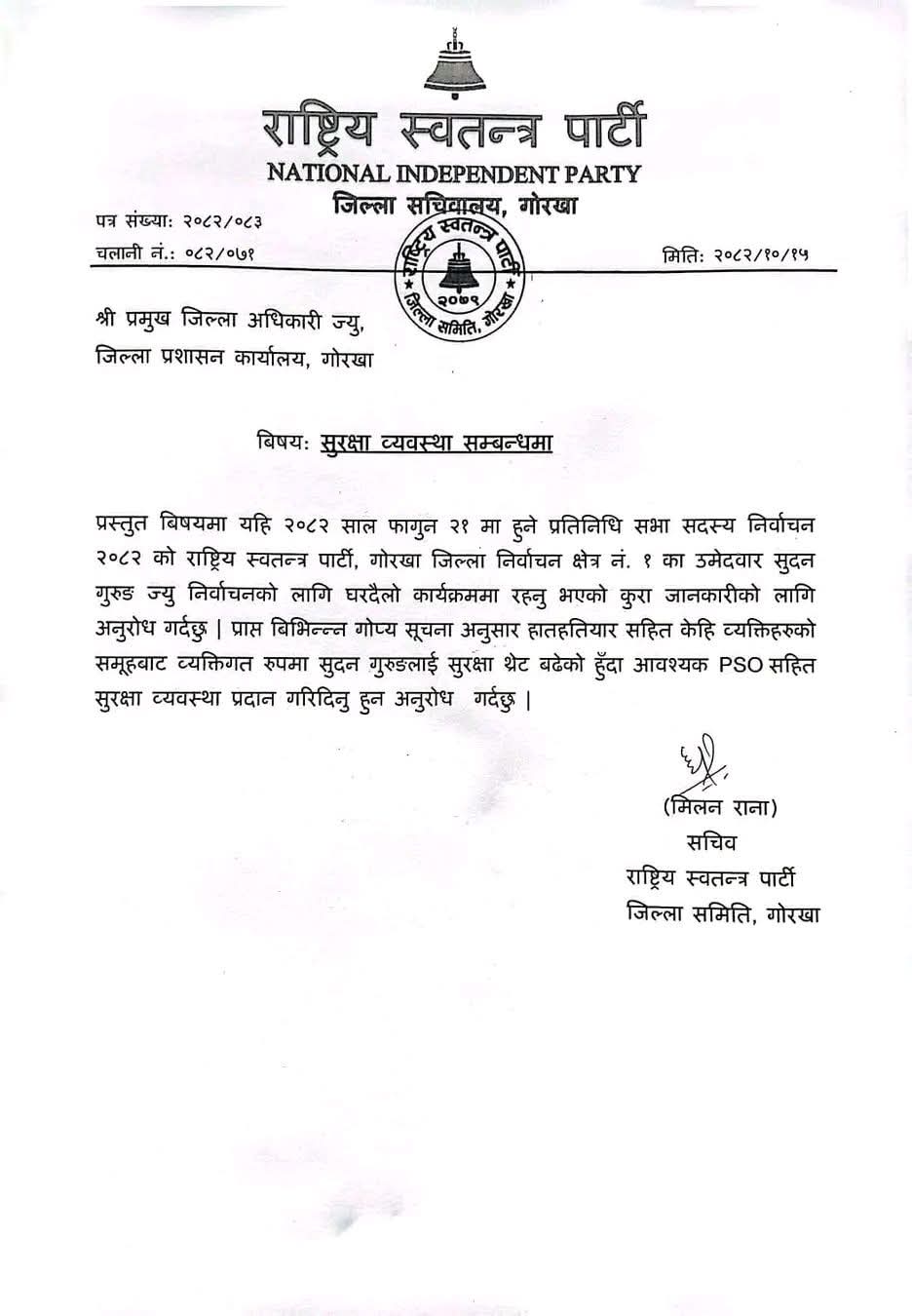 फागुन २१ मा हुने प्रतिनिधि सभा सदस्य निर्वाचनमा गोरखा–१ बाट उम्मेदवार बनेका गुरुङ घरदैलो कार्यक्रममा सहभागी भइरहेका छन्। यसक्रममा रास्वपाको जिल्ला समितिले जिल्ला प्रशासन कार्यालय, गोरखा लाई पत्र लेखेर पीएसओसहित सुरक्षा व्यवस्था सुनिश्चित गर्न अनुरोध गरेको छ।