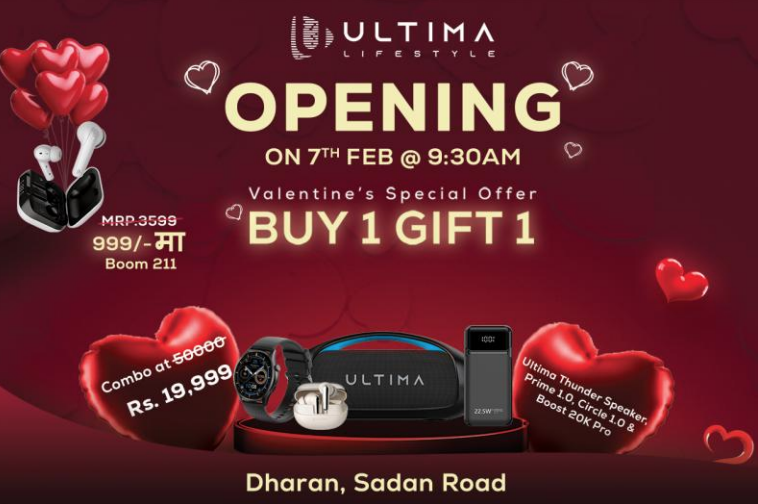 काठमाडौ । नेपालको नम्बर–१ अडियो तथा वेयरेबल्स ब्रान्ड अल्टिमा लाइफस्टायलले धरानमा नयाँ आधिकारिक स्टोर सञ्चालनमा ल्याएको छ। स्टोर उद्घाटनको अवसरमा फेब्रुअरी ७ देखि १४ सम्म भ्यालेन्टाइन क्याम्पेन सञ्चालन हुनेछ।