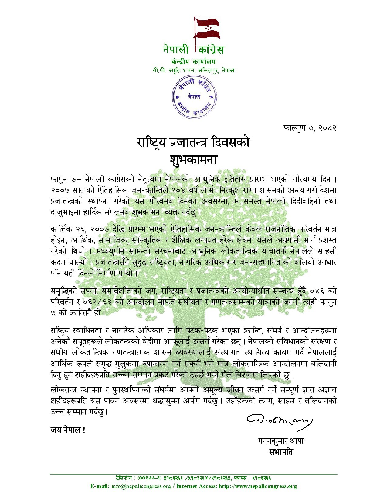 अन्तमा उनले सबै नेपालीमा प्रजातन्त्र दिवसको मंगलमय शुभकामना व्यक्त गर्दै, ज्ञात अज्ञात सपूतहरूको त्याग र साहसको उच्च सम्मान गरेका छन्।