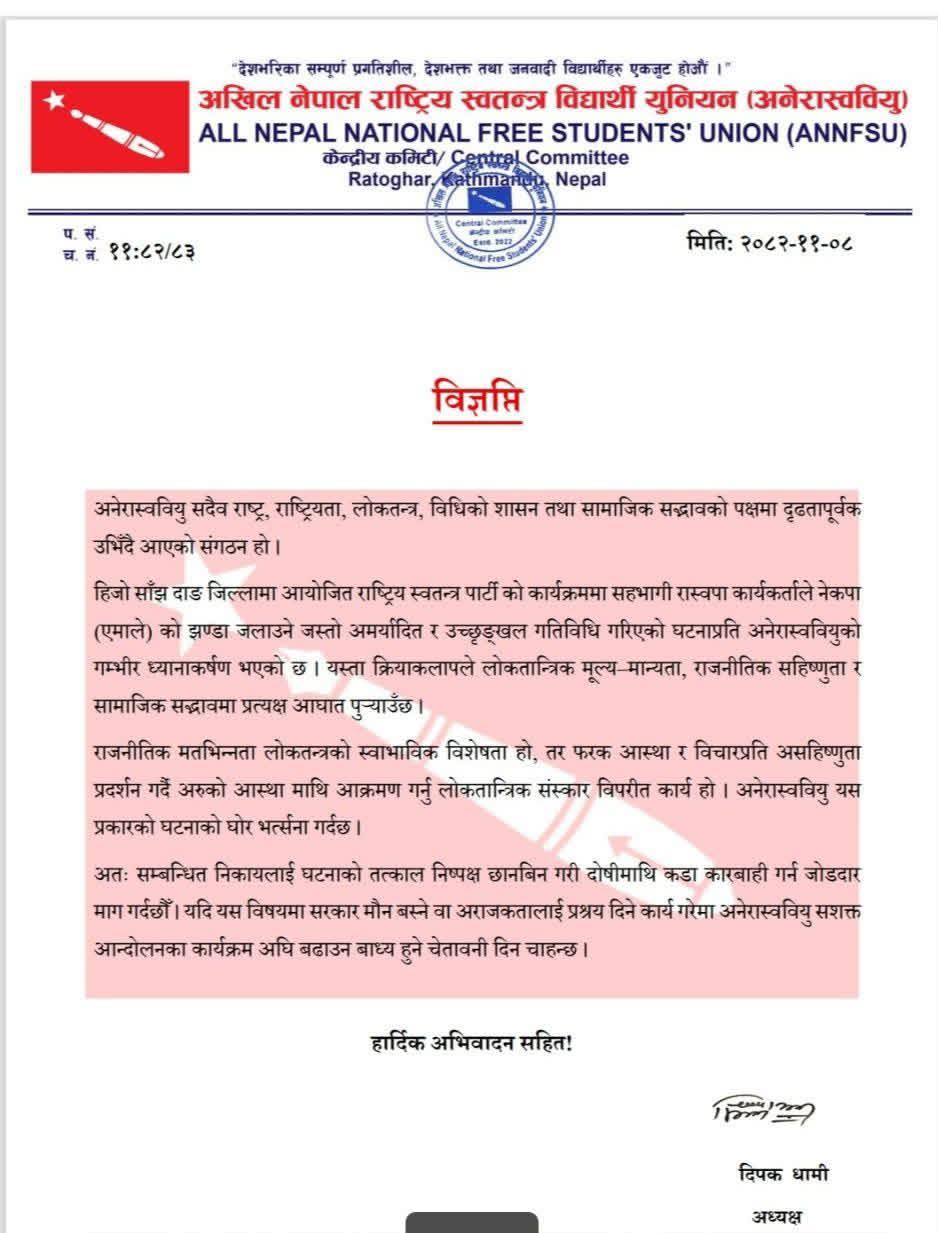 काठमाडौ । नेकपा एमाले निकट विद्यार्थी संगठन अनेरास्ववियुले दाङमा रास्वपा कार्यकर्ताले ‘सूर्य’ अंकित झण्डा जलाएको घटनाप्रति आपत्ति जनाएको छ।