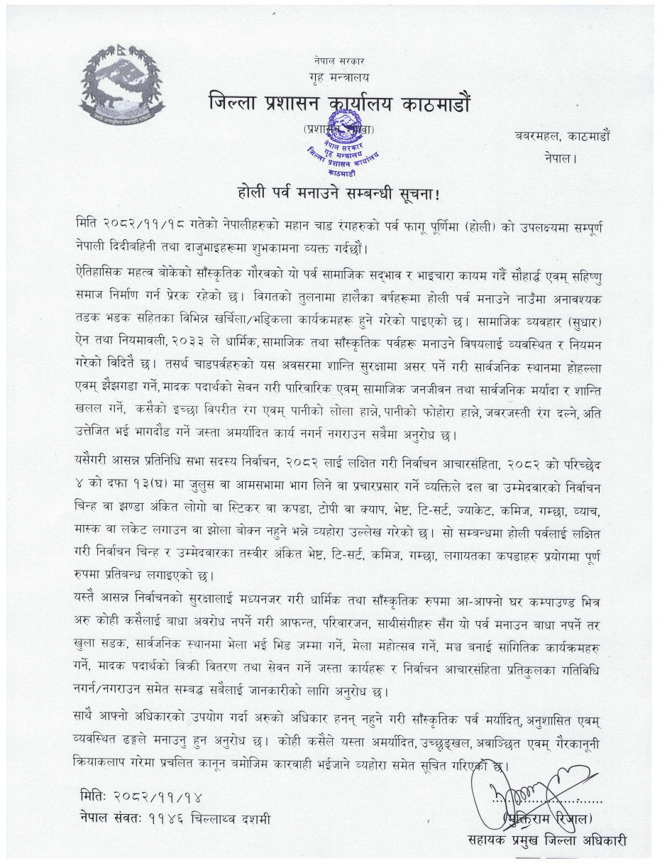 कसैको इच्छाविपरीत रंग दल्ने, लोला हान्ने, पानी छ्याप्ने वा जबरजस्ती गरे कानुनी कारबाही हुने चेतावनी प्रशासनले दिएको छ। यसपटक होली पर्व निर्वाचनको समयसँग जुधेकाले राजनीतिक गतिविधि झल्किने कुनै पनि सामग्री प्रयोग गर्न नपाइने स्पष्ट गरिएको छ।