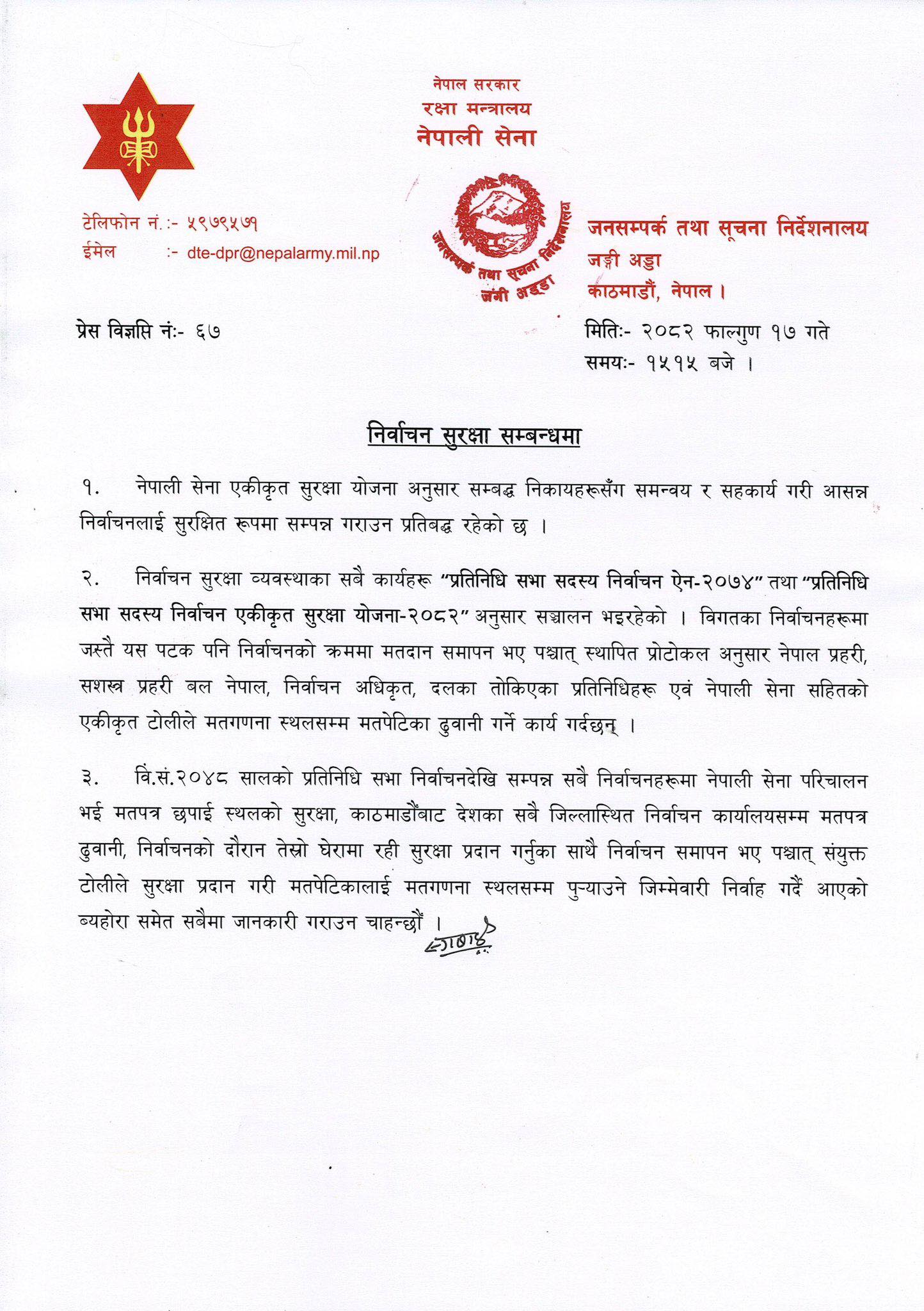 सेनाले जारी गरेको विज्ञप्तिमा प्रतिनिधिसभा सदस्य निर्वाचनलाई सुरक्षित, निष्पक्ष र व्यवस्थित रूपमा सम्पन्न गराउन एकीकृत सुरक्षा योजना अनुरूप काम भइरहेको जनाएको छ। सुरक्षा व्यवस्थासम्बन्धी सम्पूर्ण कार्यहरू प्रतिनिधि सभा सदस्य निर्वाचन ऐन–२०७४ र प्रतिनिधि सभा सदस्य निर्वाचन एकीकृत सुरक्षा योजना–२०८२ अनुसार सञ्चालन भइरहेको उल्लेख गरिएको छ।