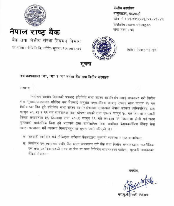 केन्द्रीय बैंकले होली पर्व तथा प्रतिनिधिसभा सदस्य निर्वाचनको दिन परेकाले फागुन २१ गते बिहीबार बैंक तथा वित्तीय संस्थाका कार्यालय खुला राख्ने व्यवस्था मिलाउन निर्देशन दिएको हो। निर्वाचनसँग सम्बन्धित वित्तीय कारोबार प्रभावित नहोस् भन्ने उद्देश्यले उक्त निर्देशन जारी गरिएको राष्ट्र बैंकले जनाएको छ।