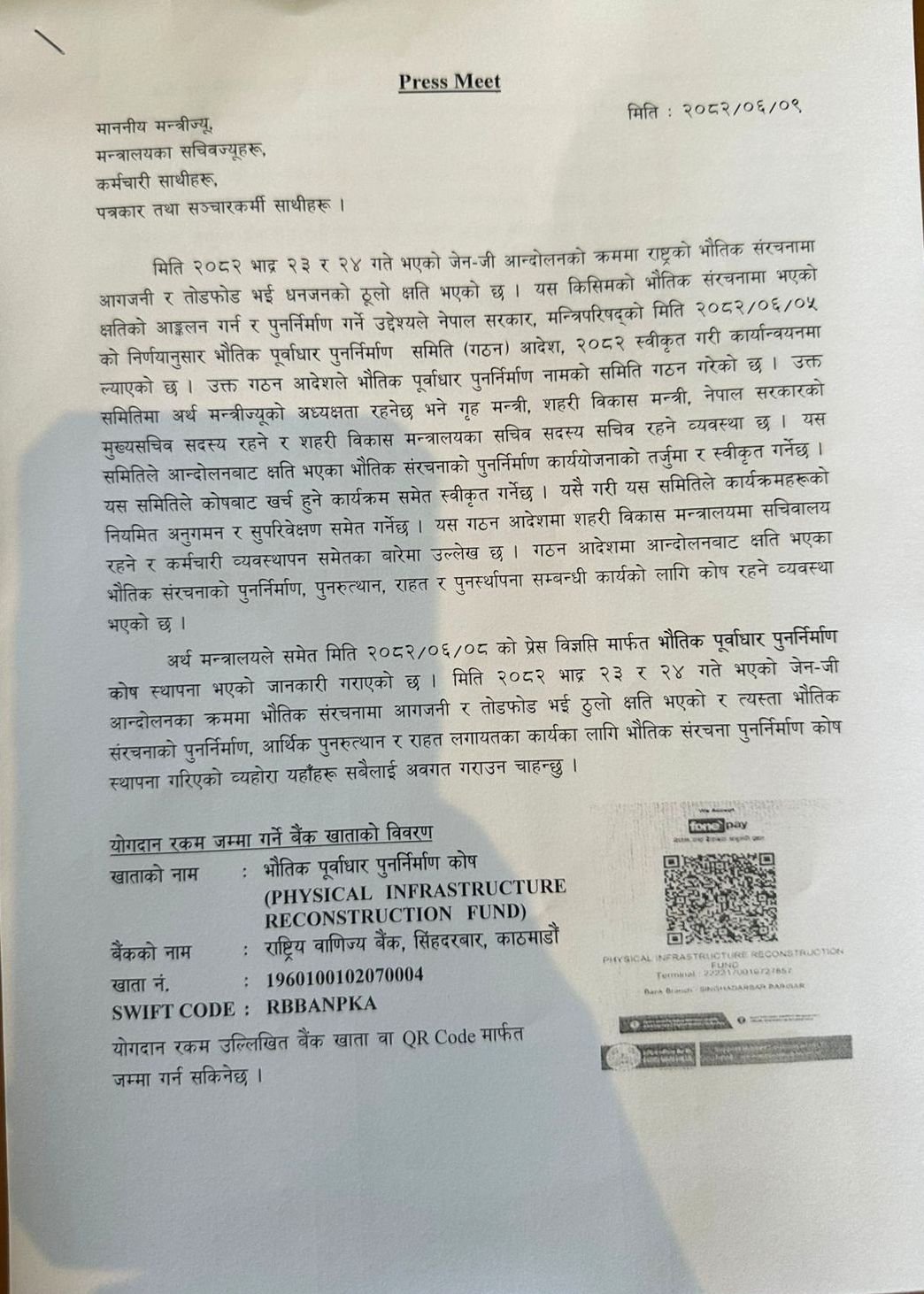 काठमाडौ । ऊर्जा, जलस्रोत तथा सिँचाइ मन्त्री कुलमान घिसिङले जेनजी आन्दोलनबाट भएको भौतिक क्षतिको पुनर्निर्माणका लागि सरकारले स्थापना गरेको पुनर्निर्माण कोषमा सहयोग गर्न सबैलाई आह्वान गरेका छन्।