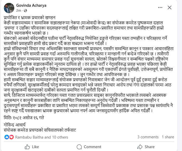 सचिवालयले प्रचण्ड र उनका परिवारका सदस्यहरूलाई लक्षित गरी सार्वजनिक भएका निराधार र चरित्रहत्या गर्ने सामग्रीहरू संविधान तथा पत्रकार आचारसंहिता विपरित रहेको उल्लेख गर्दै, यस्ता सामग्रीहरूले पार्टी नेतृत्वमा अस्थिरता सिर्जना गर्ने प्रयास गरेको दाबी गरेको छ।