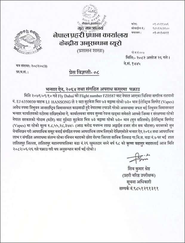 ०७९ पुस १० गते फ्लाइ दुबईको जहाजमार्फत नेपाल आएका चिनियाँ नागरिक लि हानसोङले २ वटा सुुटकेसभित्र ७३ बट्टामा रहेको ७३० वटा विद्युतीय चुरोट (भेप) अवैध रुपमा त्रिभुवन अन्तर्राष्ट्रिय विमानस्थल हुँदै नेपाल भित्र्याएको प्रकरणमा महरा जोडिएका छन्।