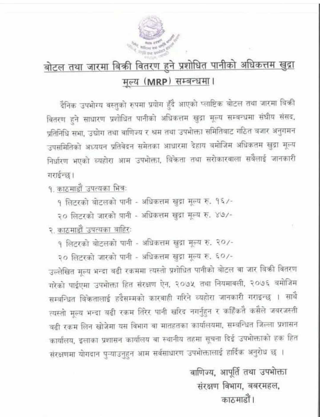 विभागले सोमबार सूचना जारी गर्दै एक लिटरको बोतल र २० लिटरको जारको मूल्य निर्धारण गरेको हो। अबदेखि काठमाडौं उपत्यकामा एक लिटर बोतल पानीको मूल्य १६ र २० लिटर जारको मूल्य रु ४७ तोकिएको छ।