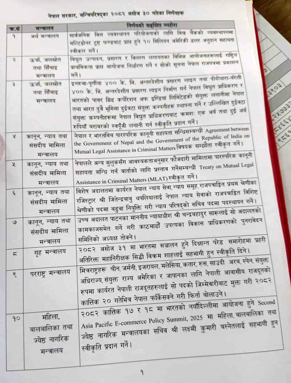 काठमाडौ । बिहीबार बसेको मन्त्रिपरिषद् बैठकले गरेका २० वटा निर्णय सार्वजनिक गरिएको छ।
