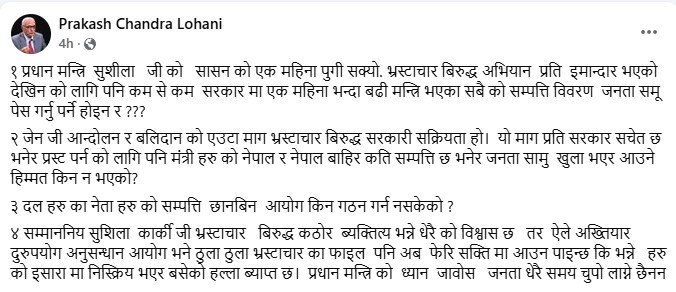 सामाजिक सञ्जालमा लेख्दै लोहनीले भनेका छन्, “जेनजी आन्दोलन र बलिदानको माग भ्रष्टाचारविरुद्ध सरकारको सक्रियता हो भन्ने देखाउन पनि मन्त्रीहरूले नेपाल र विदेशमा कति सम्पत्ति राखेका छन् भन्ने जानकारी जनतासामु खुला गर्ने हिम्मत किन छैन?”