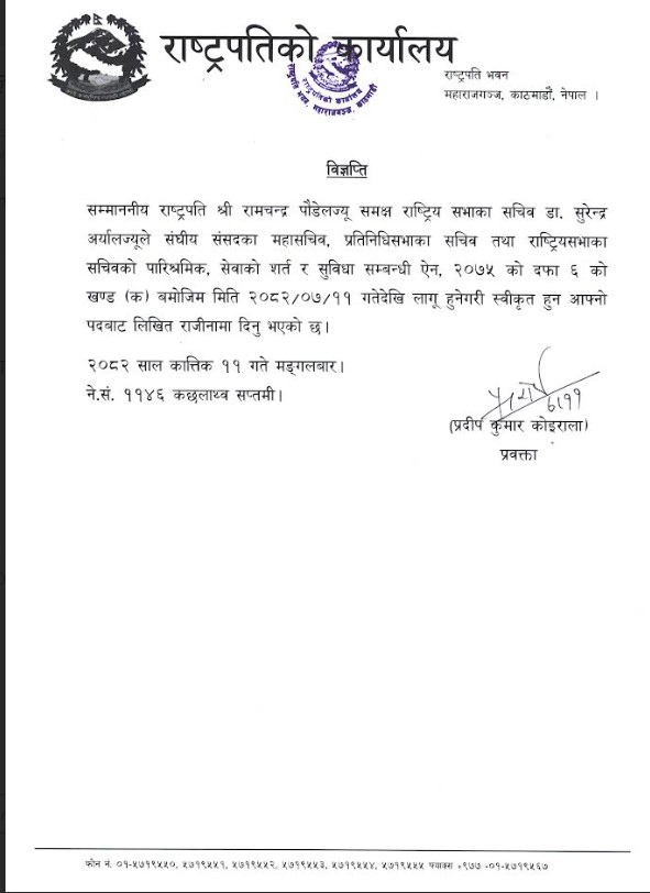 राष्ट्रियसभाका सचिव डा. सुरेन्द्र अर्यालको राजीनामा, राष्ट्रपति पौडेलद्वारा स्वीकृति