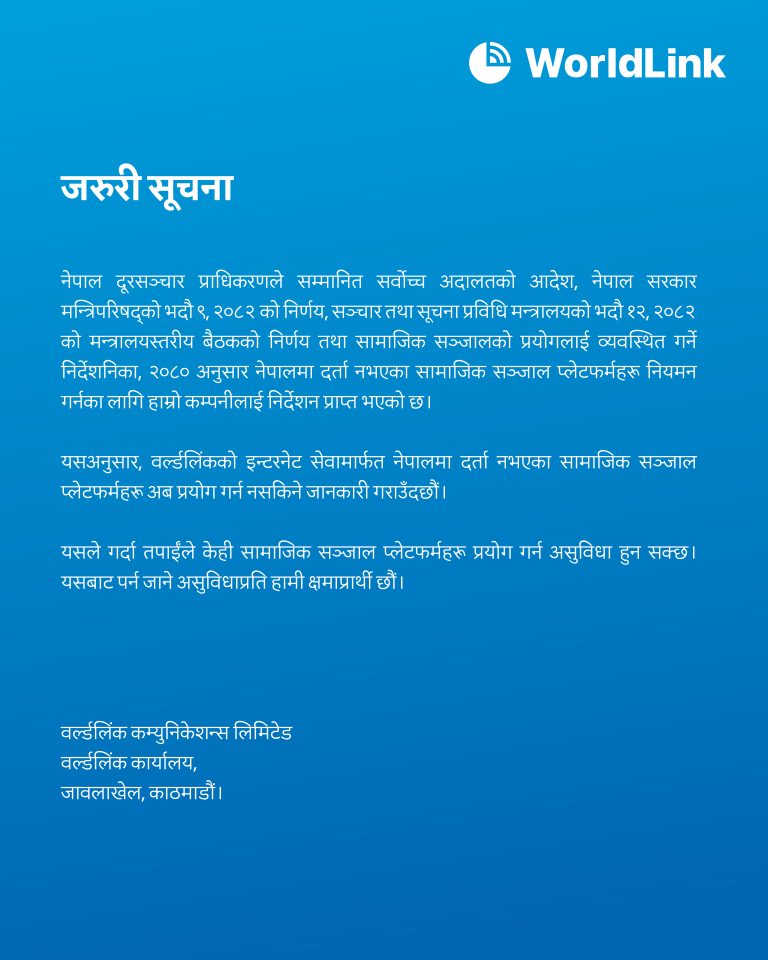 विज्ञप्तिमा भनिएको छ, “नेपाल सरकार, सञ्चार तथा सूचना प्रविधि मन्त्रालय, र नेपाल दूरसञ्चार प्राधिकरणको निर्देशनअनुसार नेपालमा दर्ता नभएका सामाजिक सञ्जाल प्लेटफर्महरू अब वर्ल्डलिंकको इन्टरनेट सेवा प्रयोग गरेर चलाउन नसकिने जभचभदथ जानकारी गराइन्छ।”