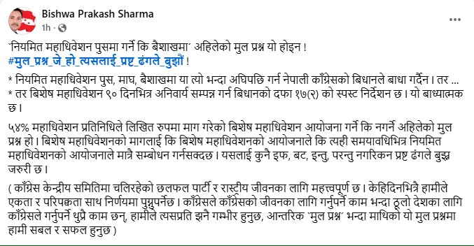 महामन्त्री शर्माले सामाजिक सञ्जालमा पोस्ट गर्दै भनेका छन्, “नियमित महाधिवेशनको मिति पुस, माघ, वैशाखमा निश्चित गर्ने मुख्य प्रश्न होइन। विशेष महाधिवेशनको आयोजनासँग सम्बन्धित मुद्दा अहिले प्रमुख कुरा हो। यो पार्टीको विधानअनुसार ९० दिनभित्र अवश्य सम्पन्न गर्नुपर्ने छ।”