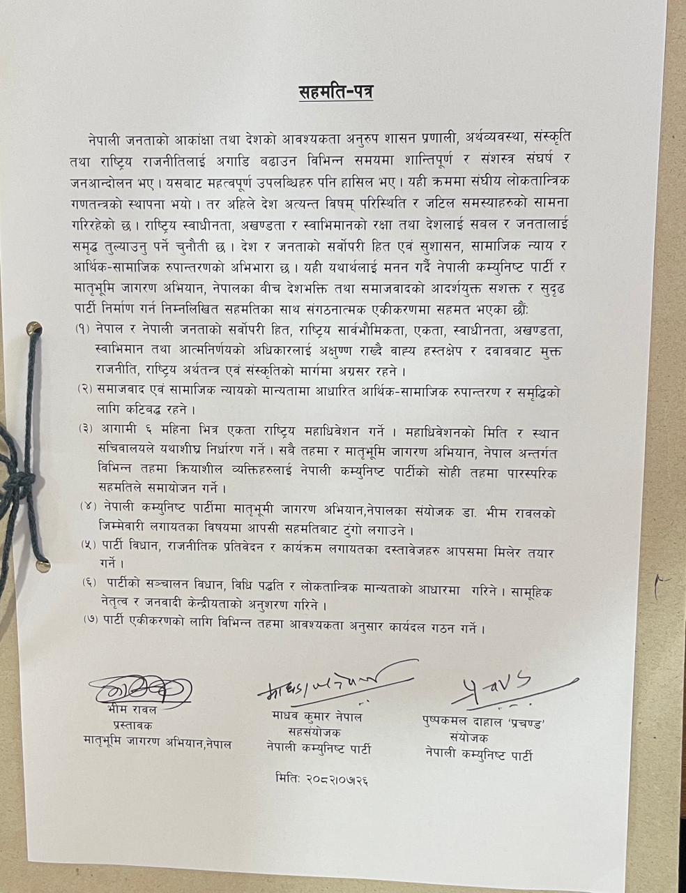 नेकपा र मातृभूमि जागरण अभियानबीच ऐतिहासिक ७ बुँदे सहमति, भीम रावल नेकपामा समाहित हुने