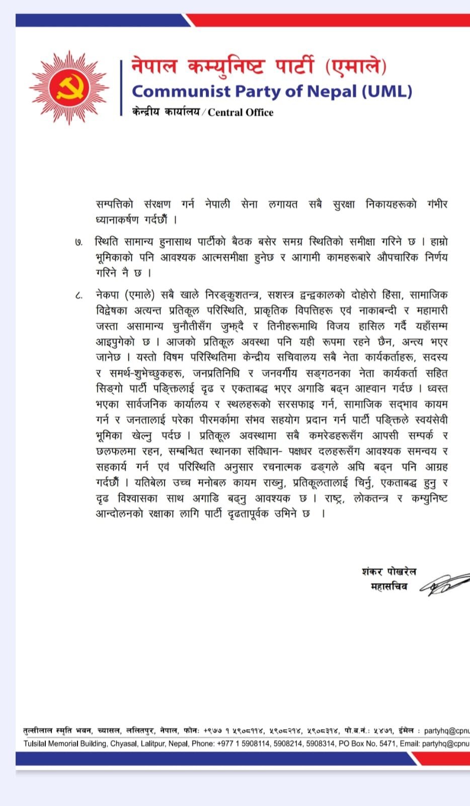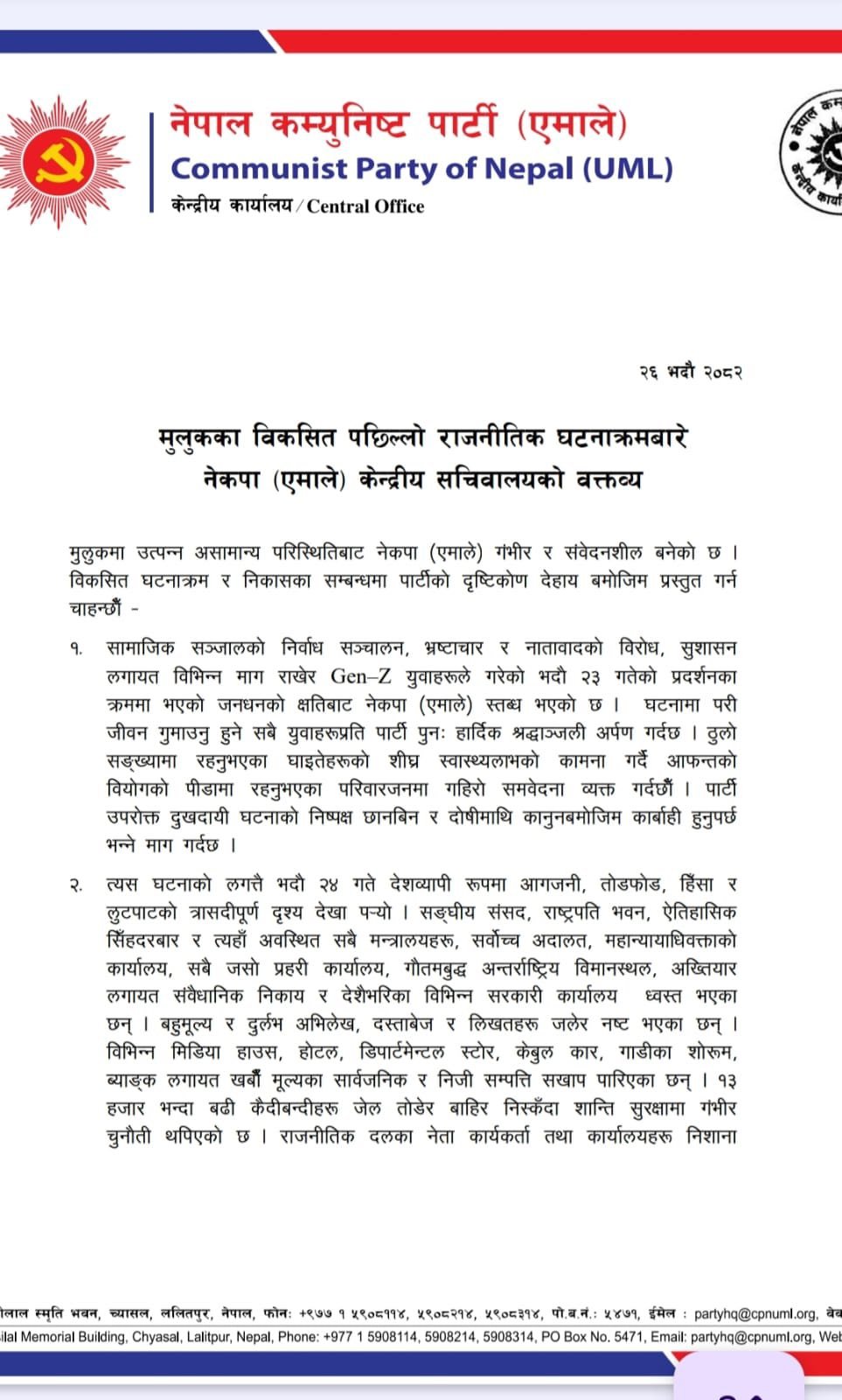 एमालेको आग्रह: संविधान र लोकतान्त्रिक प्रक्रिया मार्फत राजनीतिक निकास खोजिनुपर्छ