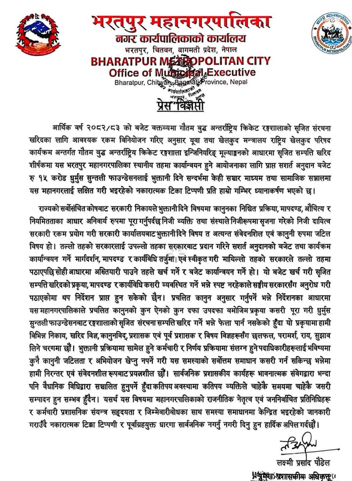 प्रचलित कानून नभएका कारण धुर्मुस सुन्तली फाउण्डेशनको ऋण फर्छ्यौट गर्न सकिएनः भरतपुर महानगरपालिका