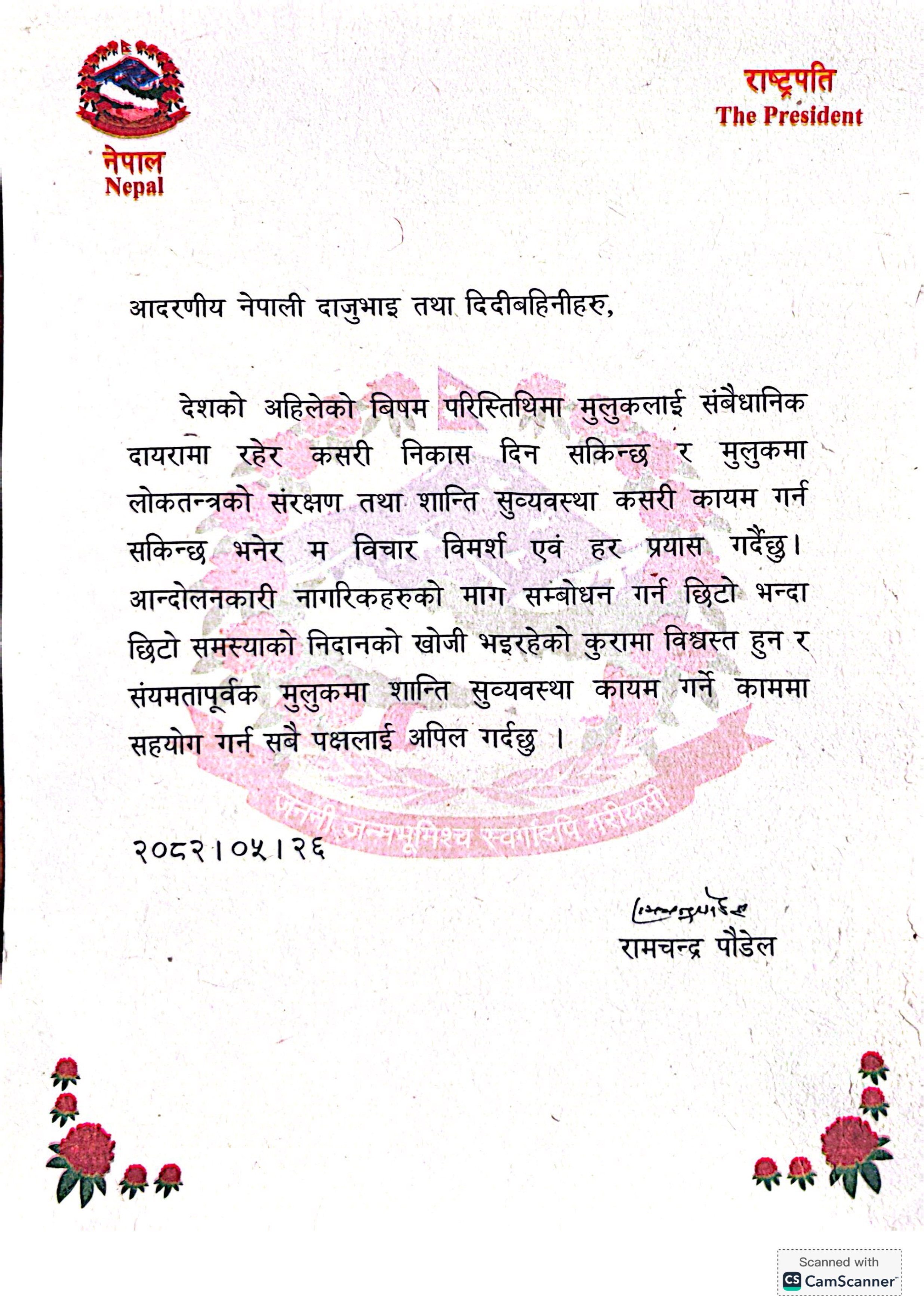 “नागरिकहरूको भावना र अभिव्यक्तिप्रतिको संवेदनशीलता सहित मुलुकमा स्थायित्व र शान्तिको स्थापना हाम्रो साझा लक्ष्य हो,” विज्ञप्तिमा उल्लेख गरिएको छ। राष्ट्रपतिले सबै पक्षलाई संयमता अपनाउन र शान्ति सुव्यवस्था कायम गर्न सहयोग गर्न अपिल गरेका छन्।