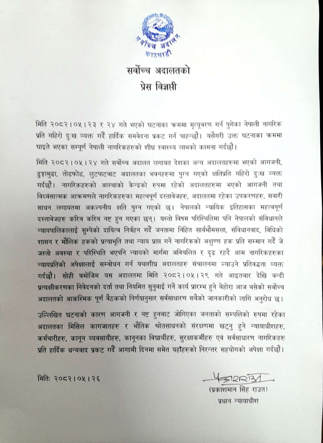 उक्त घटनाबाट सर्वोच्च अदालतको संरचनामा गम्भीर क्षति पुगेको थियो। यसप्रति प्रधान न्यायाधीश राउतले गहिरो दुःख व्यक्त गरेका छन्।