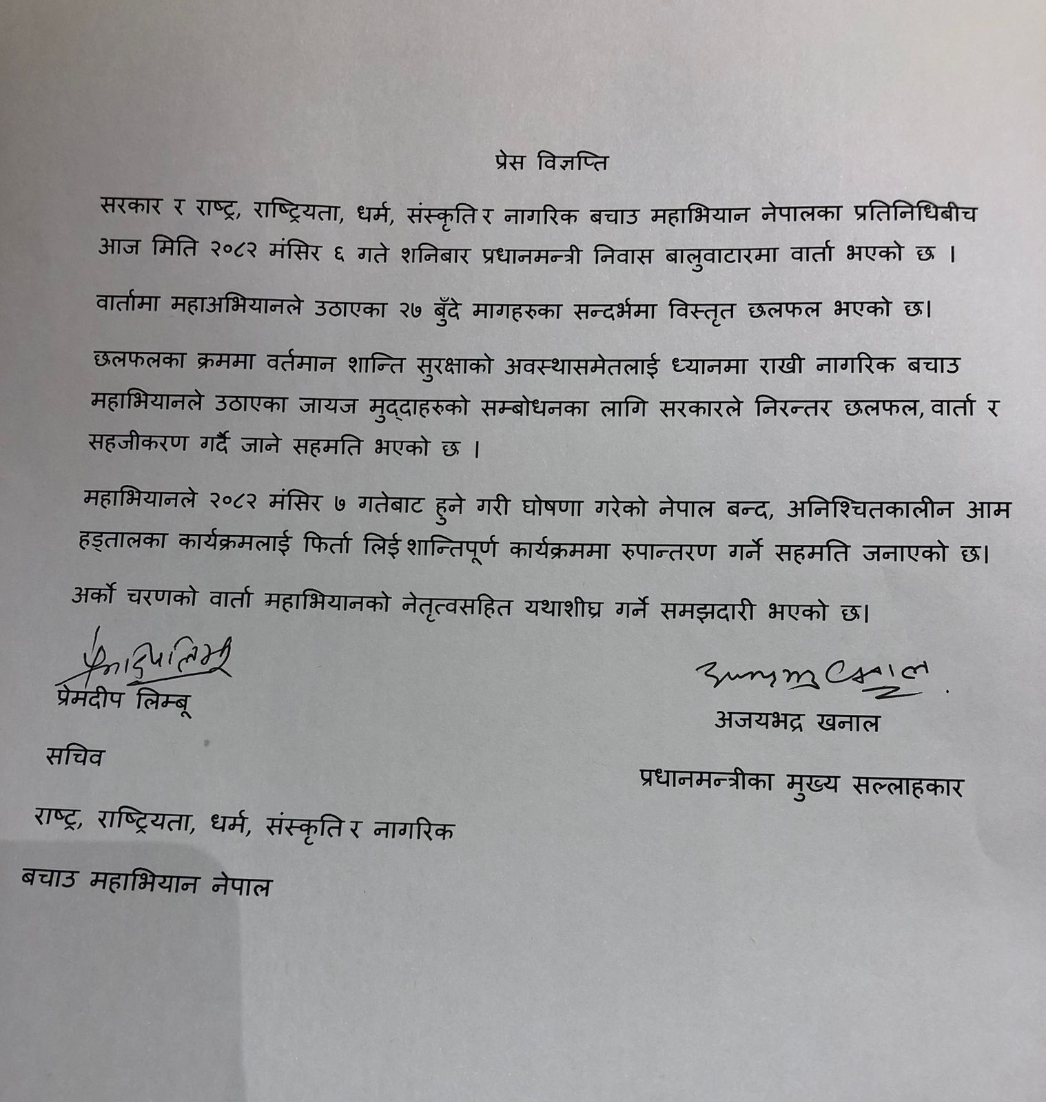 वार्ता शनिबार बेलुका प्रधानमन्त्री निवास बालुवाटारमा भएको थियो । बैठकमा महाअभियानले पेस गरेका २७ बुँदे मागमाथि छलफल भएको भन्दै शान्ति सुरक्षाको संवेदनशील अवस्था बिग्रिने जोखिम देखिएकाले बन्द फिर्ता लिएको बताइएको छ ।