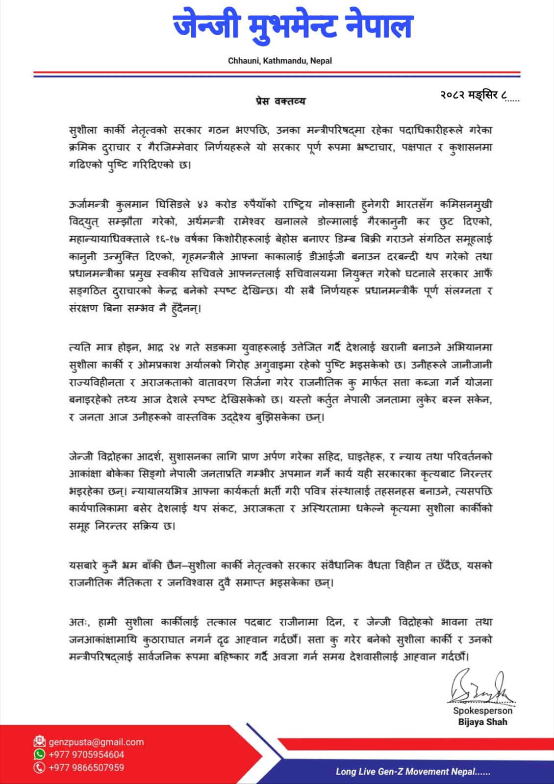 जेनजी मूभमेन्ट नेपालले माग्यो प्रधानमन्त्री कार्की नेतृत्व सरकारको राजीनामा