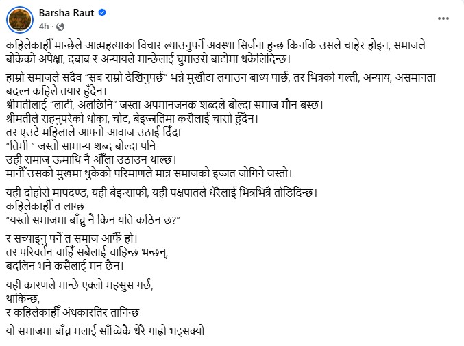 उनले समाजको दोहोरो मापदण्डप्रति पनि कठोर असन्तुष्टि व्यक्त गरेकी छन्।