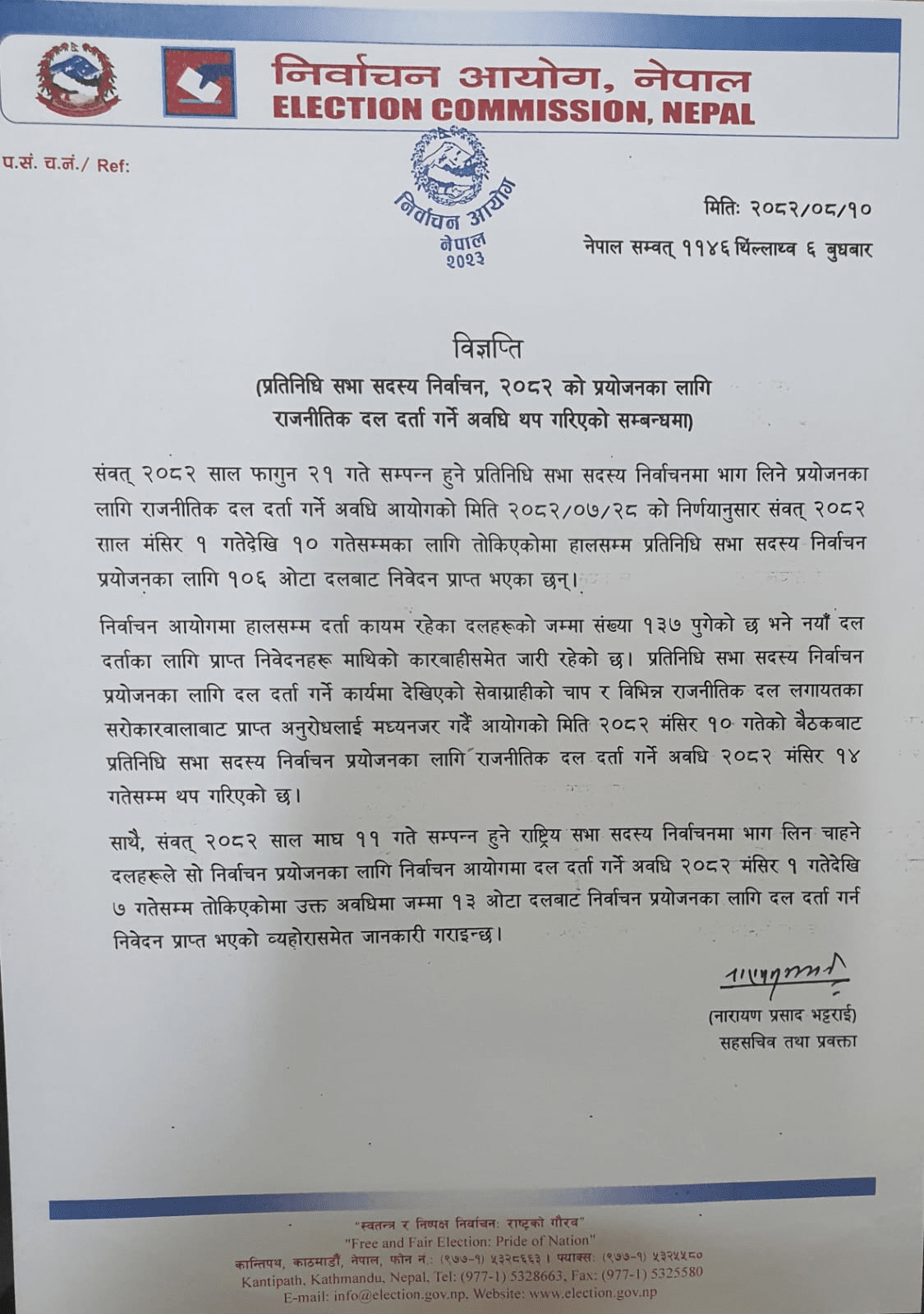 काठमाडौ । निर्वाचन आयोगले फागुन २१ गतेका लागि तोकिएको प्रतिनिधिसभा निर्वाचनलाई लक्षित गर्दै दल दर्ताको समय चार दिन थपेको छ।