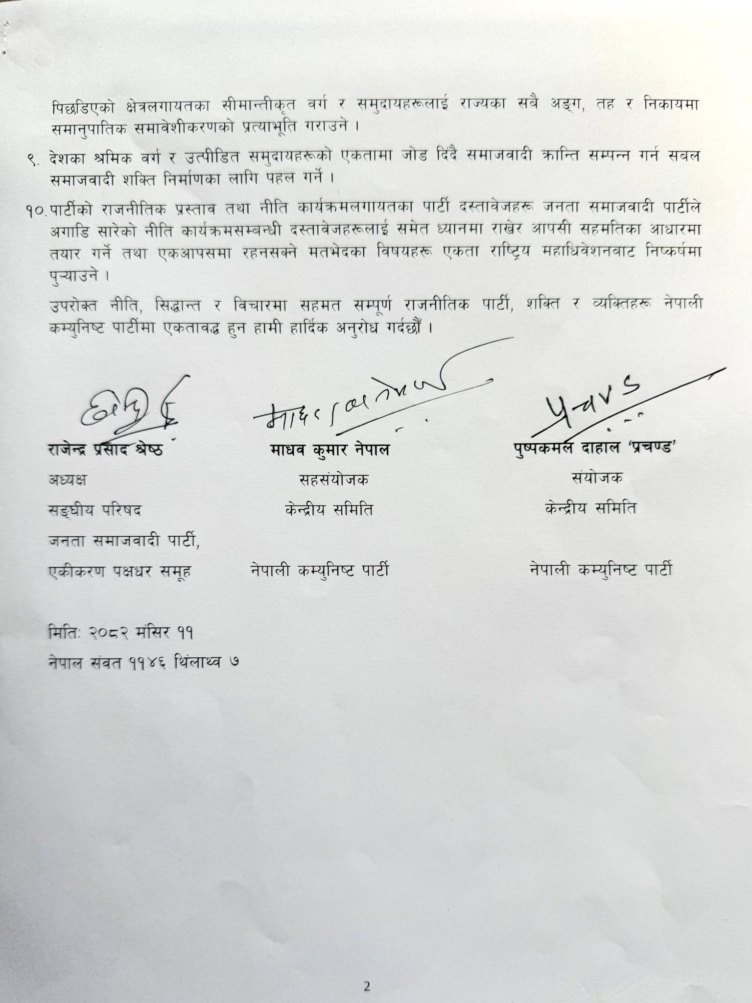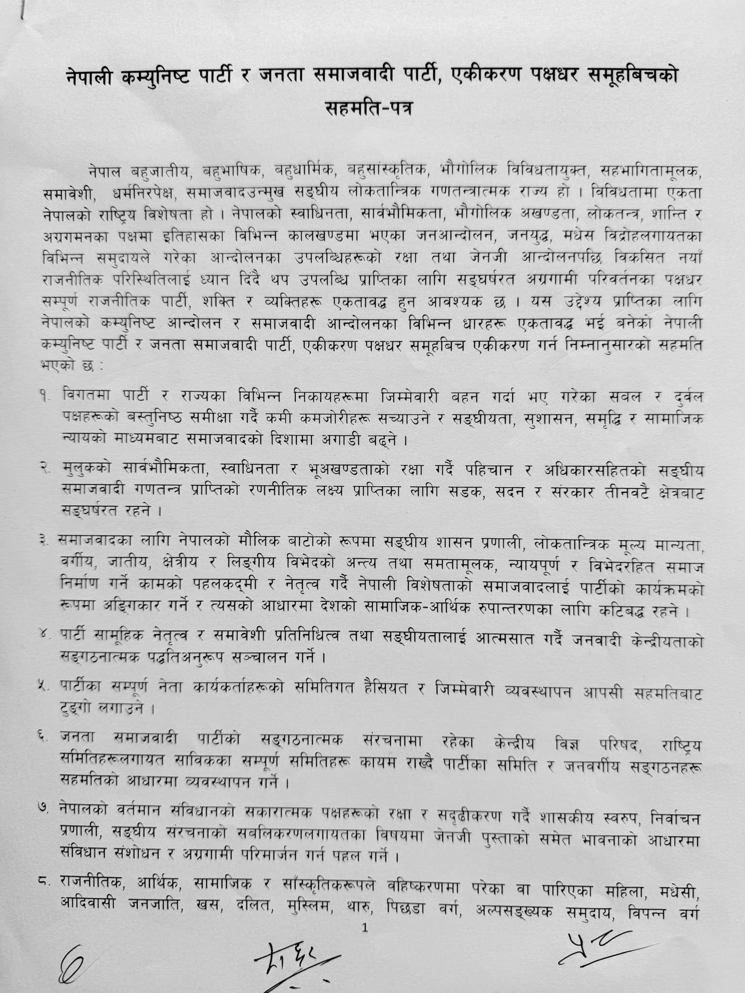 सहमतिपत्रमा नेकपाका संयोजक पुष्पकमल दाहाल ‘प्रचण्ड’, सहसंयोजक माधव नेपाल र जसपाको तर्फबाट संघीय परिषद् अध्यक्ष राजेन्द्र श्रेष्ठले हस्ताक्षर गरेका हुन्।
