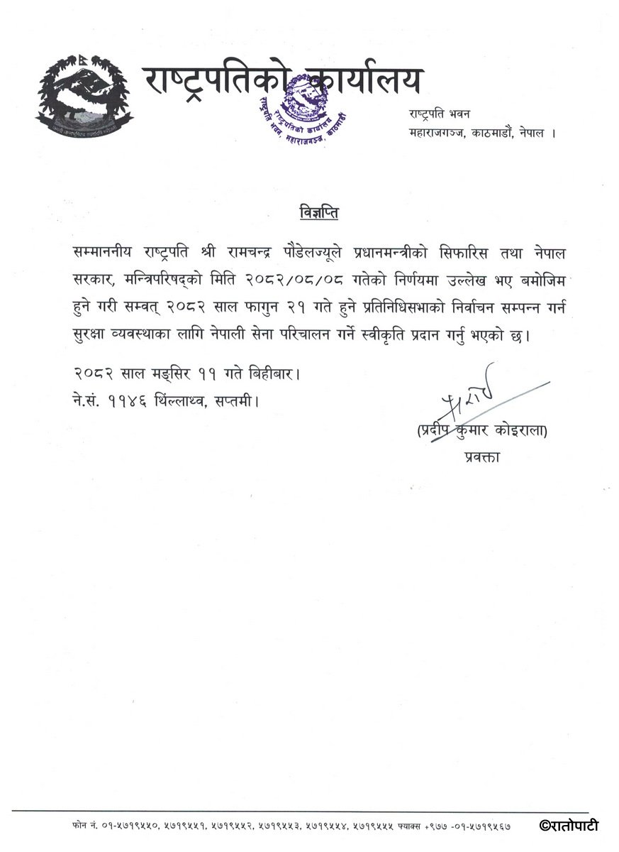 काठमाडौ । आगामी फागुन २१ गते हुन लागेको प्रतिनिधिसभा निर्वाचनलाई सुरक्षित, शान्तिपूर्ण र व्यवस्थित रूपमा सम्पन्न गराउन राष्ट्रपति रामचन्द्र पौडेलले नेपाली सेना परिचालनको स्वीकृति प्रदान गरेका छन्।
