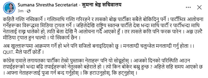 रास्वपाकी नेतृ सुमना श्रेष्ठद्वारा पार्टी परित्याग