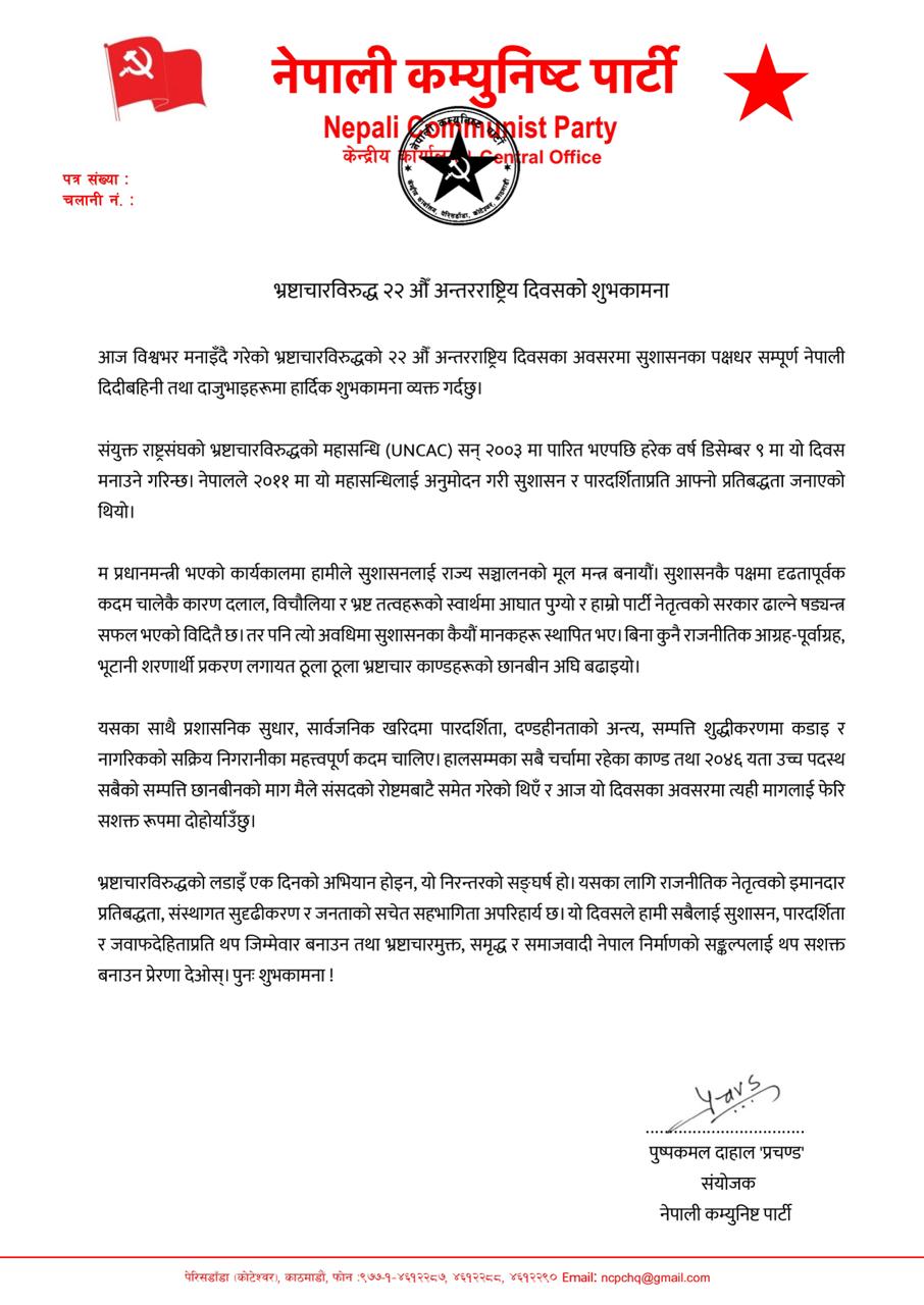 भ्रष्टाचारविरुद्धको २२औँ अन्तर्राष्ट्रिय दिवसको अवसरमा मंगलबार जारी सन्देशमा प्रचण्डले भने, “सम्पत्ति छानबिनको माग मैले संसद्को रोस्टमबाटै गरेको थिएँ। आज यो दिवसको अवसरमा त्यही मागलाई फेरि सशक्त रूपमा दोहोर्याउँछु।”