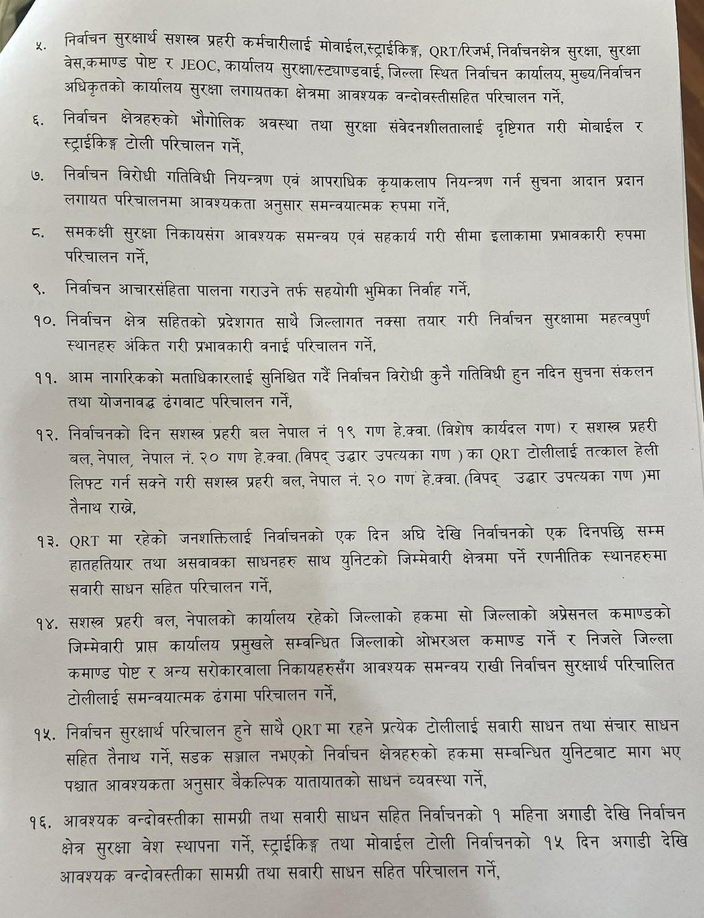 सशस्त्र प्रहरी बलका अनुसार, निर्वाचनलाई कुनै पनि प्रकारको अराजकता र अव्यवस्थाबाट बचाउन सुरक्षा व्यवस्था कडा पारिनेछ। यो नीति लागू गर्नका लागि विशेष तयारी गरिएको छ, जसमा सुरक्षा बलका विभिन्न टोलीहरूलाई संवेदनशील स्थानमा तैनाथ गरिनेछ।