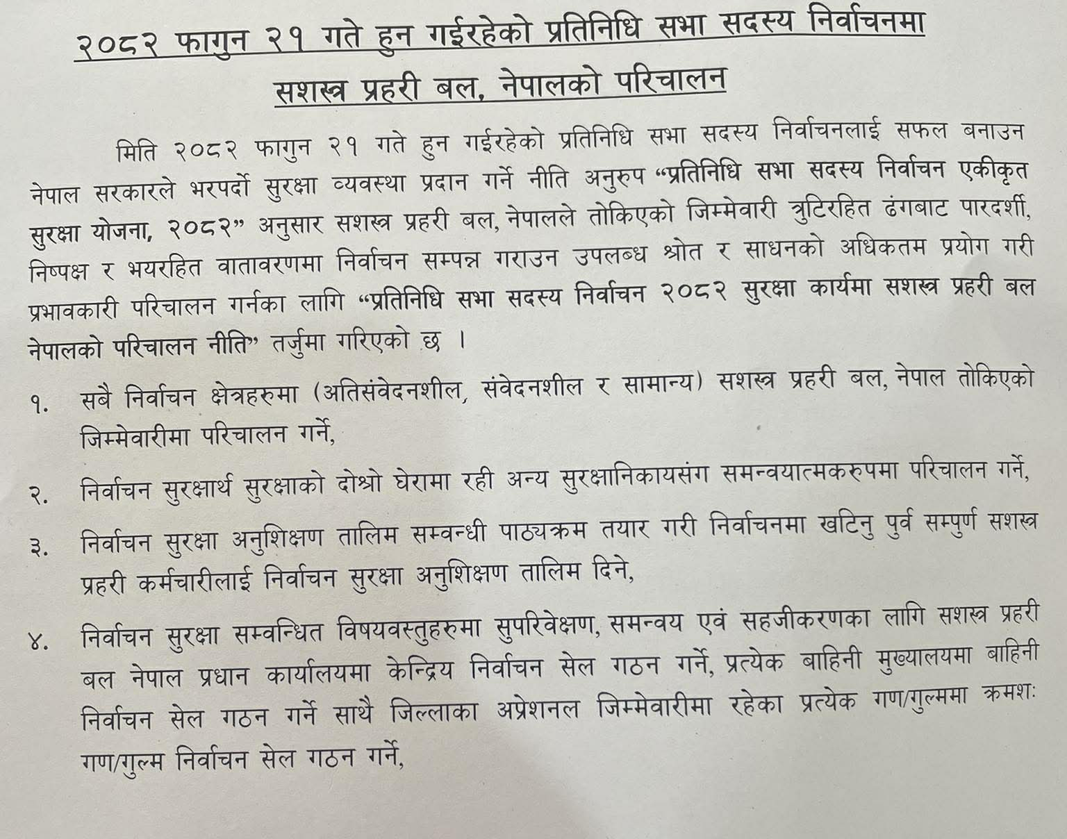 सशस्त्र प्रहरीले प्रतिनिधि सभा निर्वाचनका लागि तय गर्यो परिचालन नीति