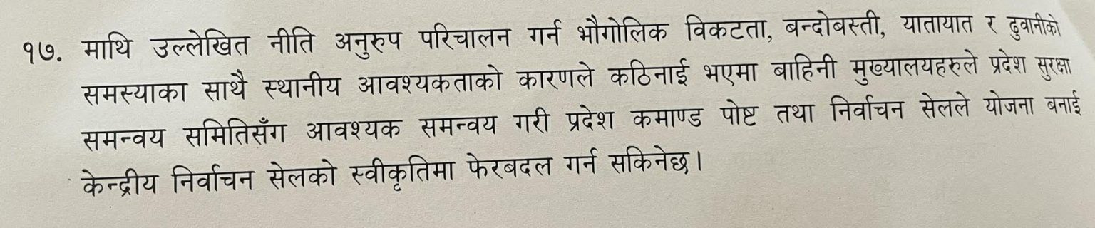 काठमाडौ । सशस्त्र प्रहरी बलले आगामी प्रतिनिधि सभा निर्वाचनको तयारीका लागि आफ्नो १७ बुँदे परिचालन नीति सार्वजनिक गरेको छ। आगामी फागनु २१ गते हुने निर्वाचनलाई पारदर्शी, निष्पक्ष र भयरहित वातावरणमा सम्पन्न गर्न सशस्त्र प्रहरी बलले यो नीति लागू गरेको हो।