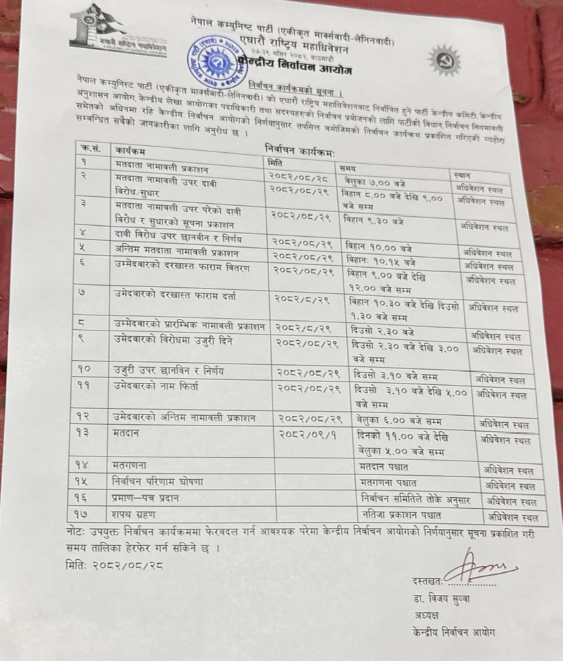 पार्टी केन्द्रीय निर्वाचन आयोगले आज साँझ ७ बजेदेखि लागू हुने निर्वाचन कार्यतालिका सार्वजनिक गरेको छ । जसअनुसार पुस १ गतेसम्म विभिन्न चरणका कार्यक्रम सञ्चालन हुनेछन्।