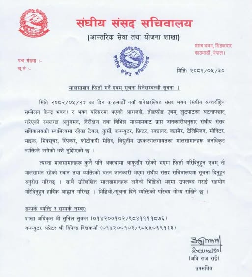 काठमाडौ । संसद सचिवालयले आज एक सूचना जारी गर्दै लुटिएका सामाग्रीहरू फिर्ता गर्न अपील गरेको छ। २४ गते जेनजी आन्दोलनको दौरान, अराजक समूहले नयाँ बानेश्वरस्थित संसद भवनमा प्रवेश गरी आगजनी, तोडफोड र लुटपाट गरेको थियो।