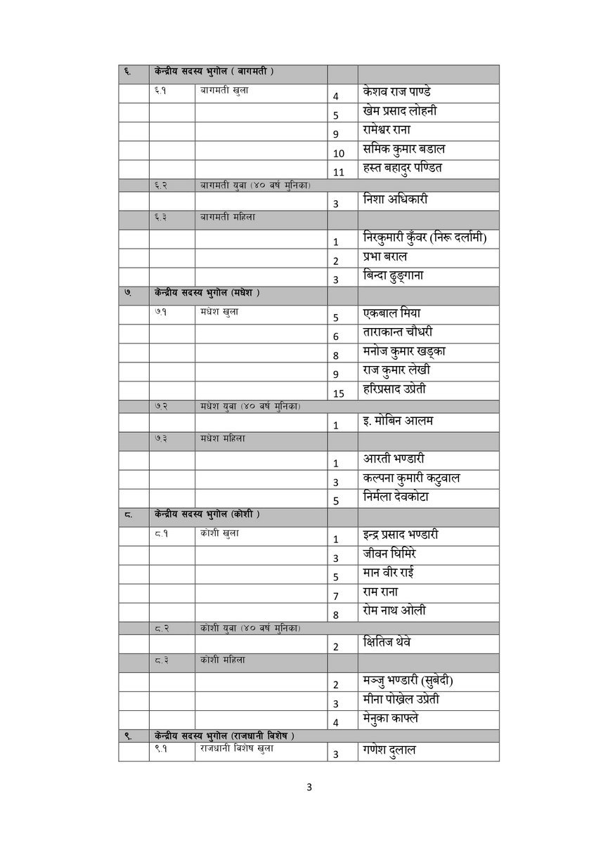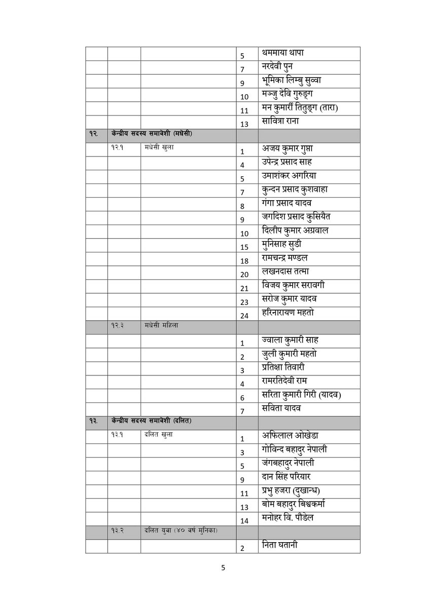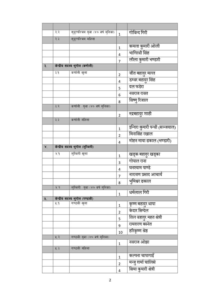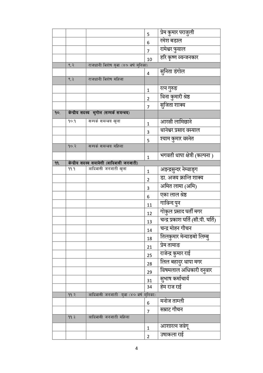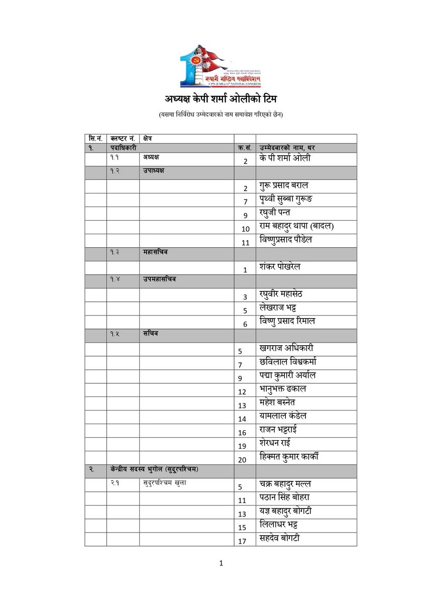 सूचीअनुसार उपाध्यक्षमा गुरु प्रसाद बराल, पृथ्वी सुब्बा गुरुङ, रघुजी पन्त, रामबहादुर थापा र विष्णु पौडेल रहेका छन् । यस्तै महासचिवमा शंकर पोखरेल रहेका छन् ।