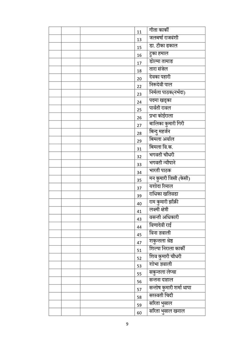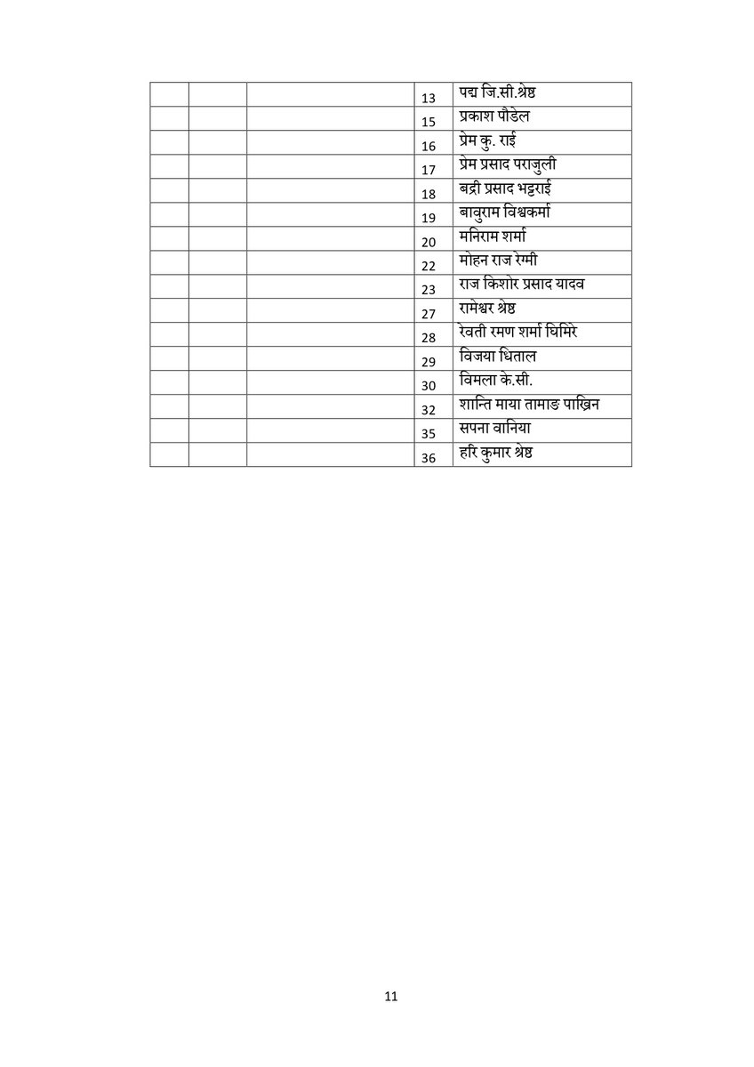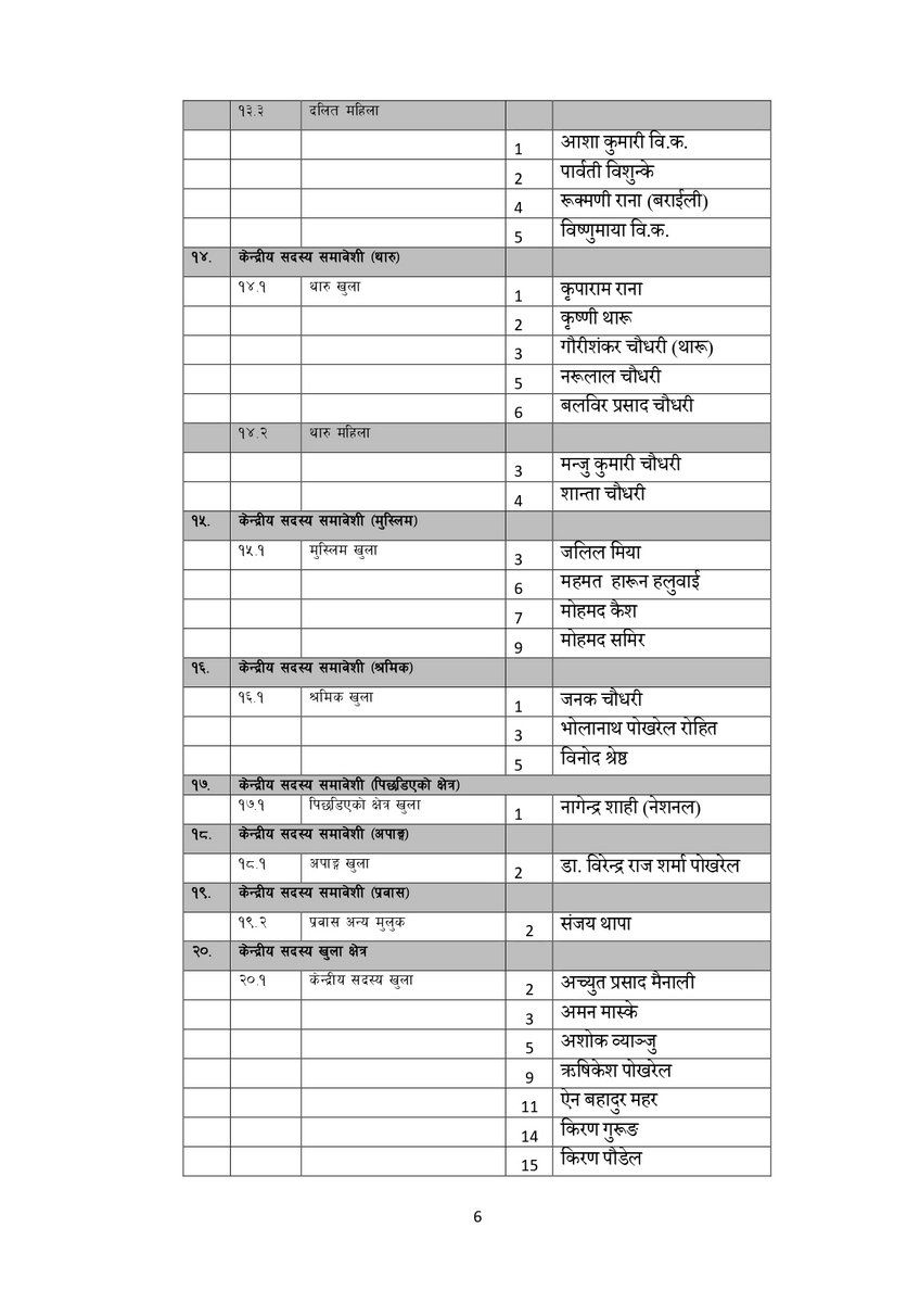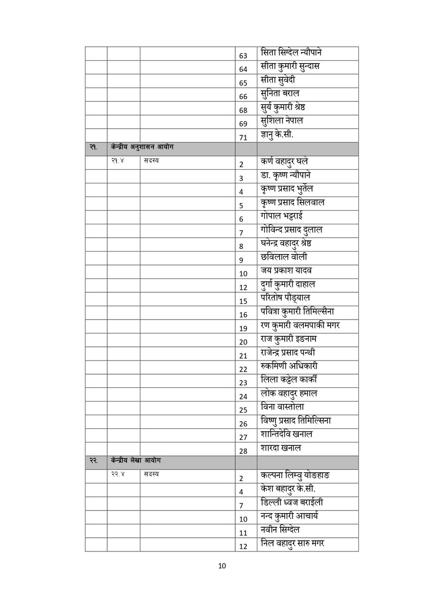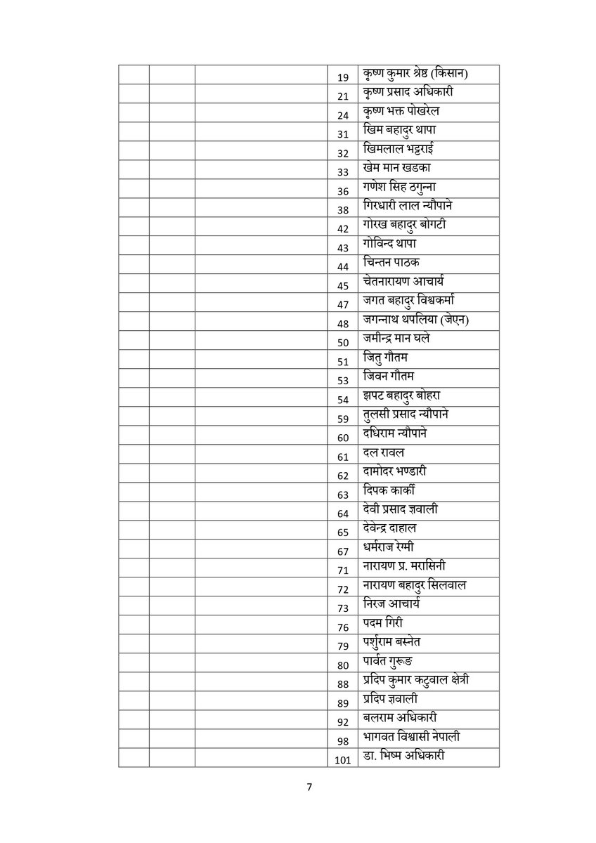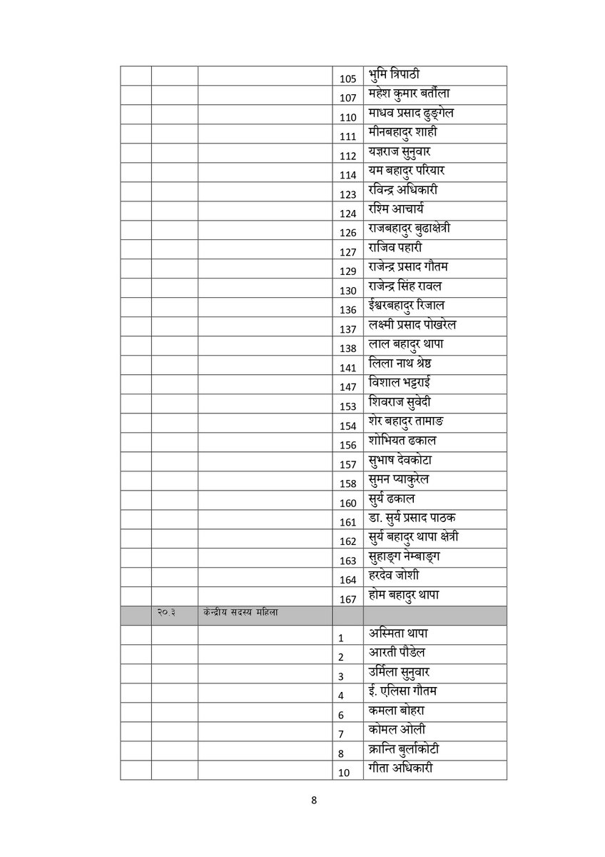 सूचीअनुसार उपाध्यक्षमा गुरु प्रसाद बराल, पृथ्वी सुब्बा गुरुङ, रघुजी पन्त, रामबहादुर थापा र विष्णु पौडेल रहेका छन् । यस्तै महासचिवमा शंकर पोखरेल रहेका छन् ।