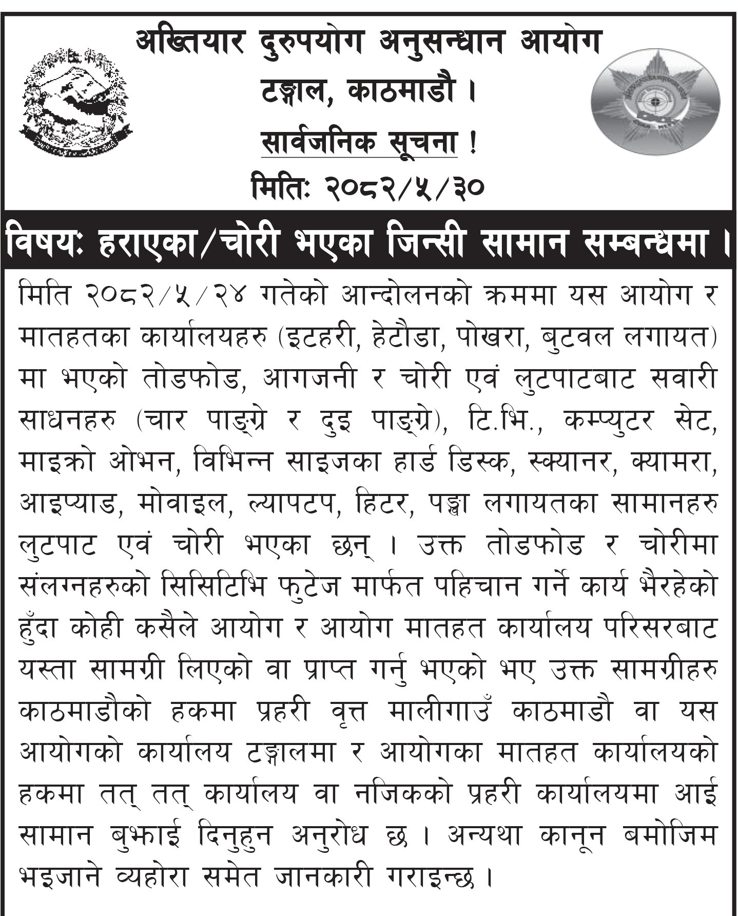 चोरी भएका सामग्रीहरू फिर्ता गर्न अख्तियारको कडा सार्वजनिक सूचना