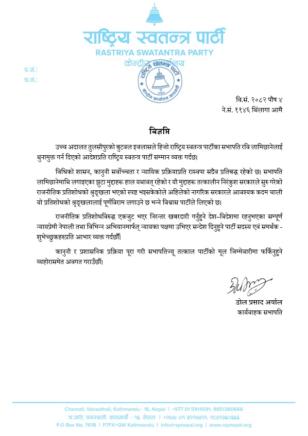 विज्ञप्तिमा रास्वपाले अदालतको आदेशप्रति सम्मान व्यक्त गर्दै न्यायिक प्रक्रियाप्रति पार्टीको प्रतिबद्धता दोहोर्याएको छ। पार्टीका अनुसार सभापति लामिछानेको पुनरागमनसँगै संगठनात्मक गतिविधि र राजनीतिक कार्यक्रमहरू थप सक्रिय बनाइनेछ।