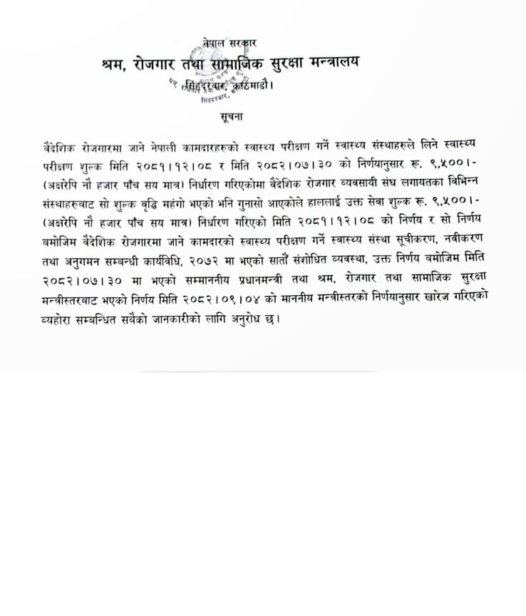 काठमाडौ । वैदेशिक रोजगारीमा जाने श्रमिकको स्वास्थ्य परीक्षण शुल्क वृद्धि अन्ततः खारेज गरिएको छ। श्रम, रोजगार तथा सामाजिक सुरक्षा मन्त्री राजेन्द्रसिंह भण्डारीले मन्त्रीस्तरीय निर्णय गर्दै बढाइएको शुल्क फिर्ता गरी पुरानै दर कायम गरेका हुन्।